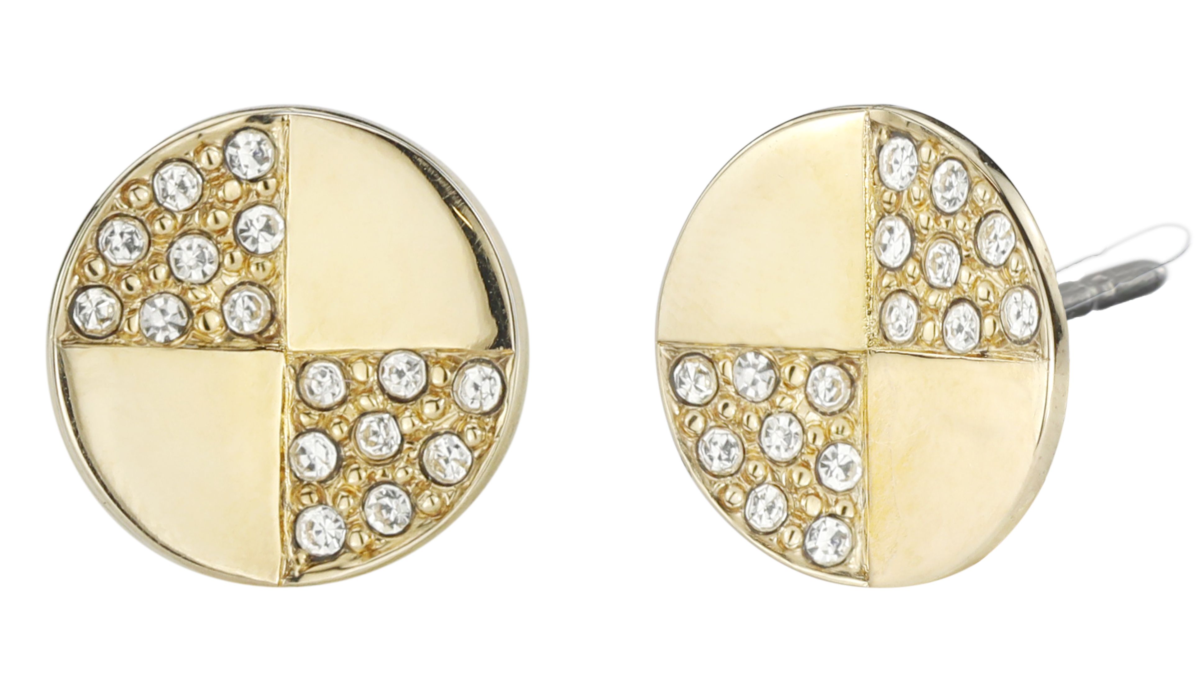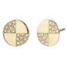 These symmetrical earrings from Traveller have a sleek and stunning design. The round stud earrings are divided into four sections, two of which are studded with Preciosa crystals. The 22 carat gold plated earrings (core material: metal) have a diameter of 1 centimetre and weigh only 1 gram each.