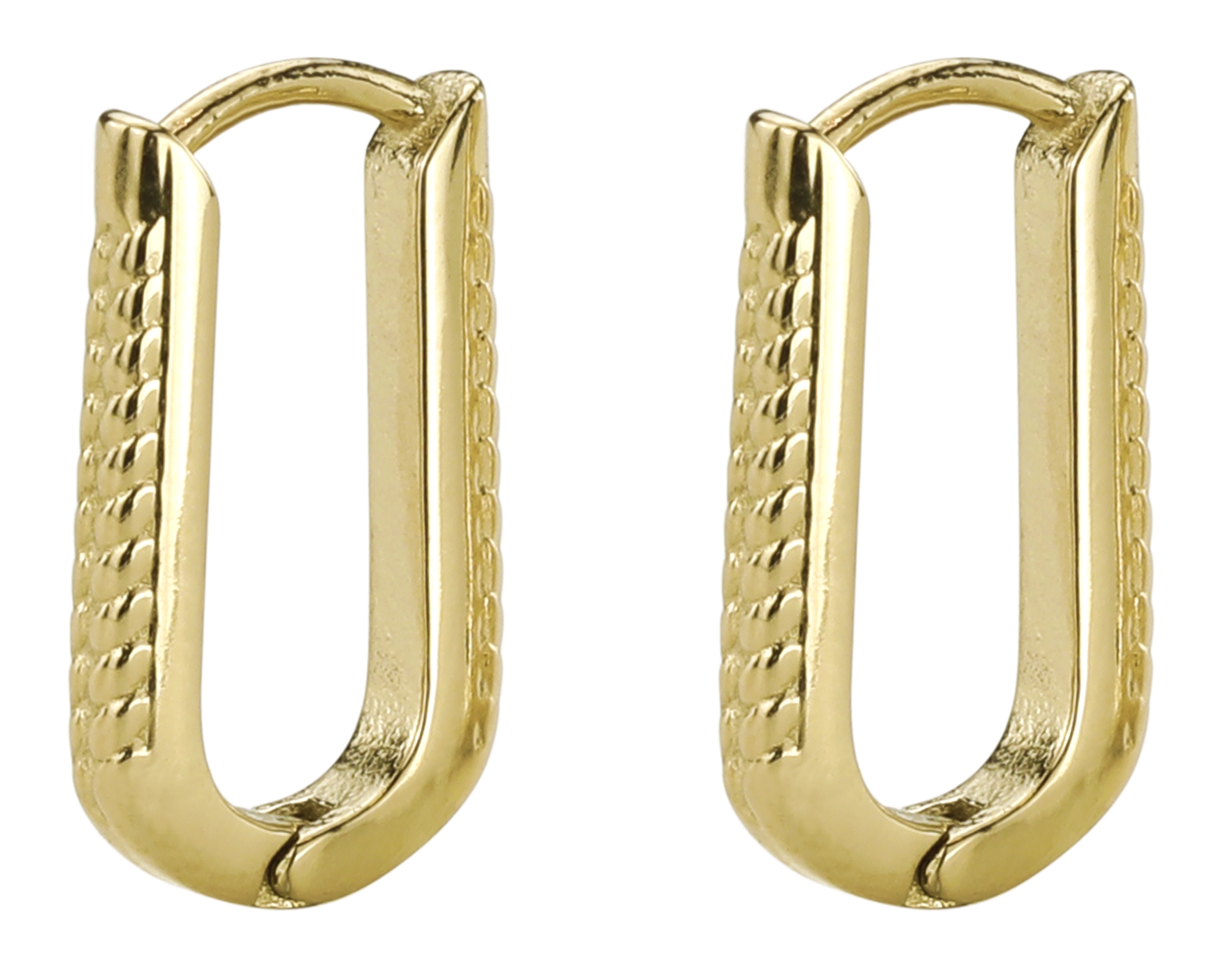 These square hoop earrings from Traveller give the classic hoop earring a modern twist. The shiny earrings are made of gold coloured stainless steel and have a diameter of 17 millimetres. Each earring weighs just under 1 gram.