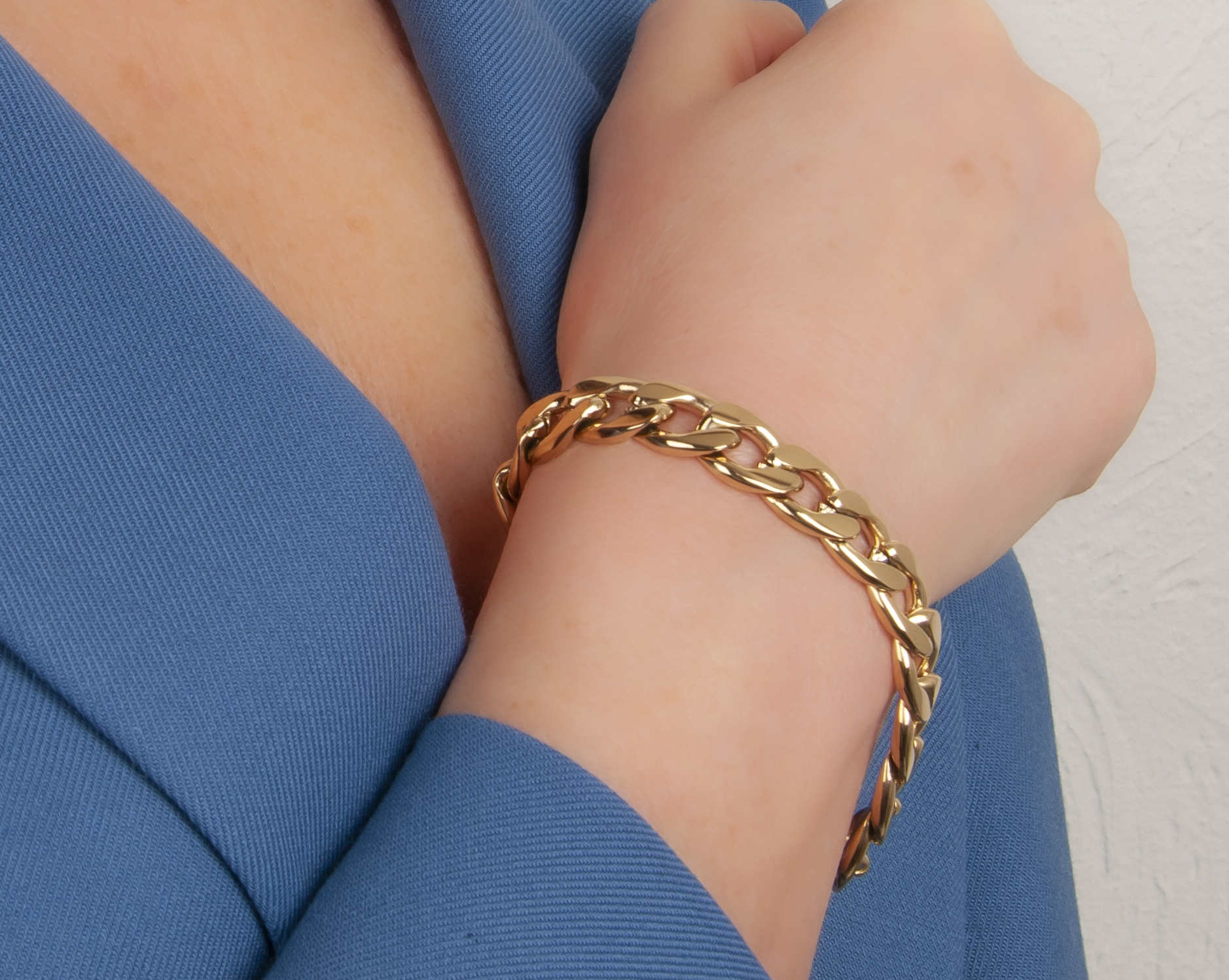 This gorgeous link bracelet completes any outfit. The gold coloured stainless steel bracelet has a length of 19 centimetres and has a timeless and elegant design. Complete the look with the matching necklace.