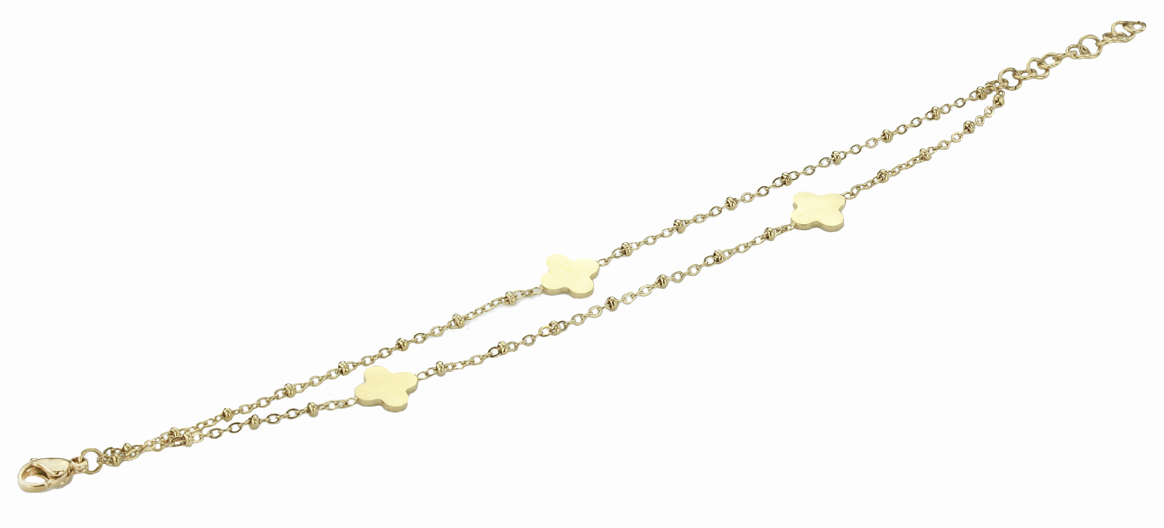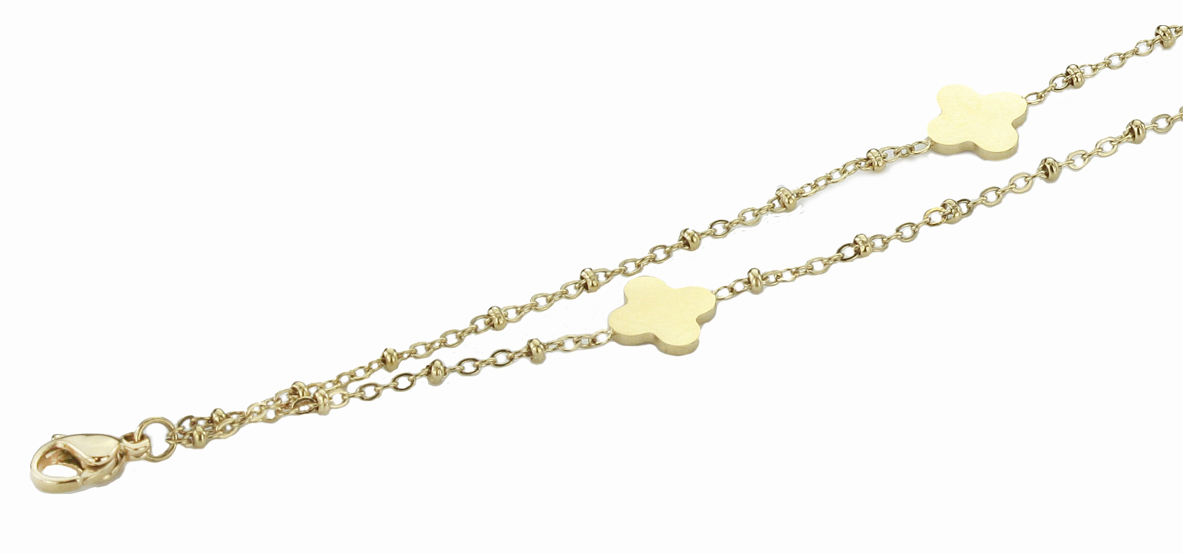 This bracelet from Traveller adds a cheerful touch to your outfit. The stainless steel bracelet consists of two chains with flowers hanging between them. The abstract design of the flowers combined with the playfulness of the chains gives this bracelet a unique look and makes it a timeless addition to countless outfits. The bracelet is adjustable in length from 18 to 21 centimetres and weighs 3 grams.
