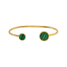 Deze stijlvolle bangle van Traveller bevatten twee prachtige echte malachietstenen. De armband is met 22 karaat goud verguld en bevat een echte gemĂȘleerde malachietsteen omringd door een gouden randje. Malachiet is een natuurproduct hierdoor kan de kleur op de foto afwijken van de kleur stenen in de armband die u ontvangt, elke steen is uniek en ziet er daardoor een klein beetje anders uit. De bangle is wat flexibel zodat deze makkelijk om de pols schuift, heeft een afmeting van circa 6 x 5 centimeter en weegt 5,2 gram.