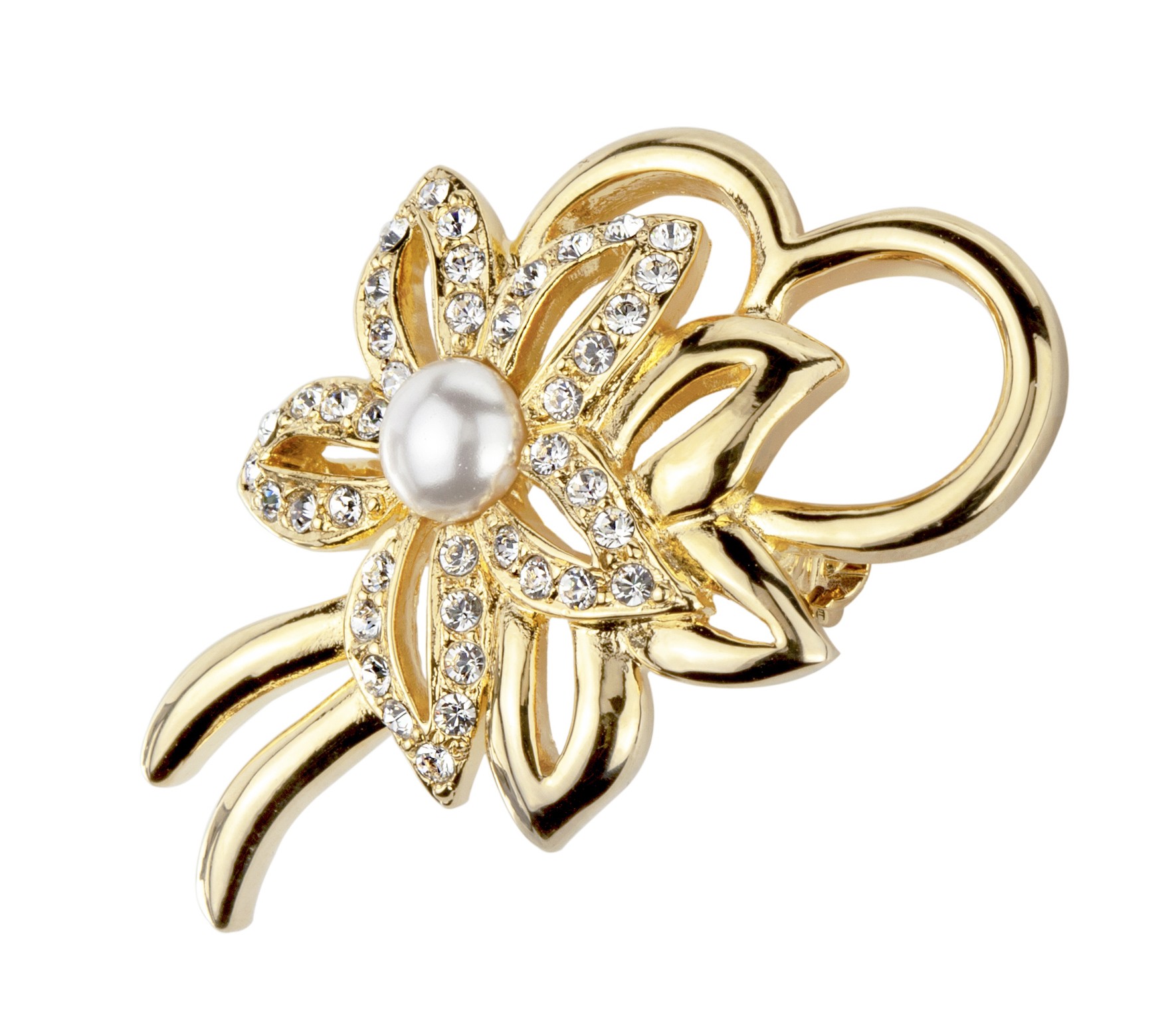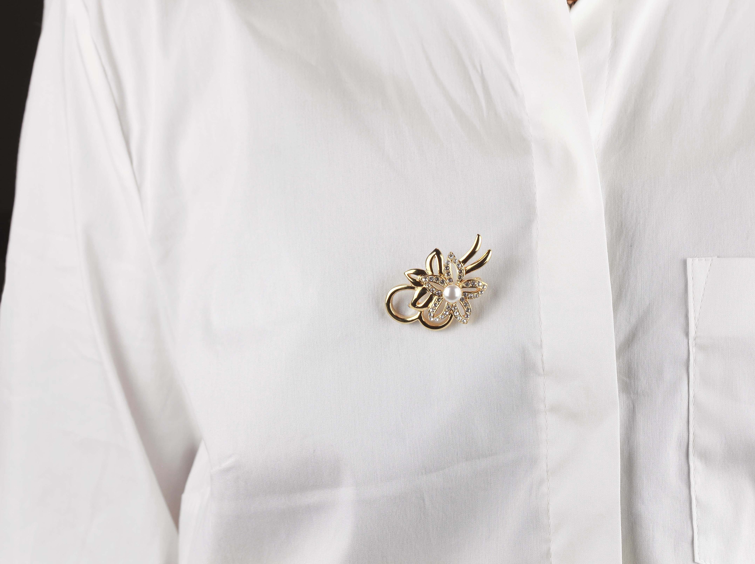 Een chique, schitterende broche van Traveller met een uniek design. De 22ct vergulde (kernmateriaal: metaal) broche heeft de vorm van twee bloemen met blaadjes en steeltjes. De bovenste bloem is bezaaid met Preciosa kristallen waarvan het hart bestaat uit een hoogwaardige imitatieparel afkomstig uit Mallorca - een eiland dat bekendstaat om zijn parels. De broche is 4 x 5 centimeter groot en weegt 7 gram.