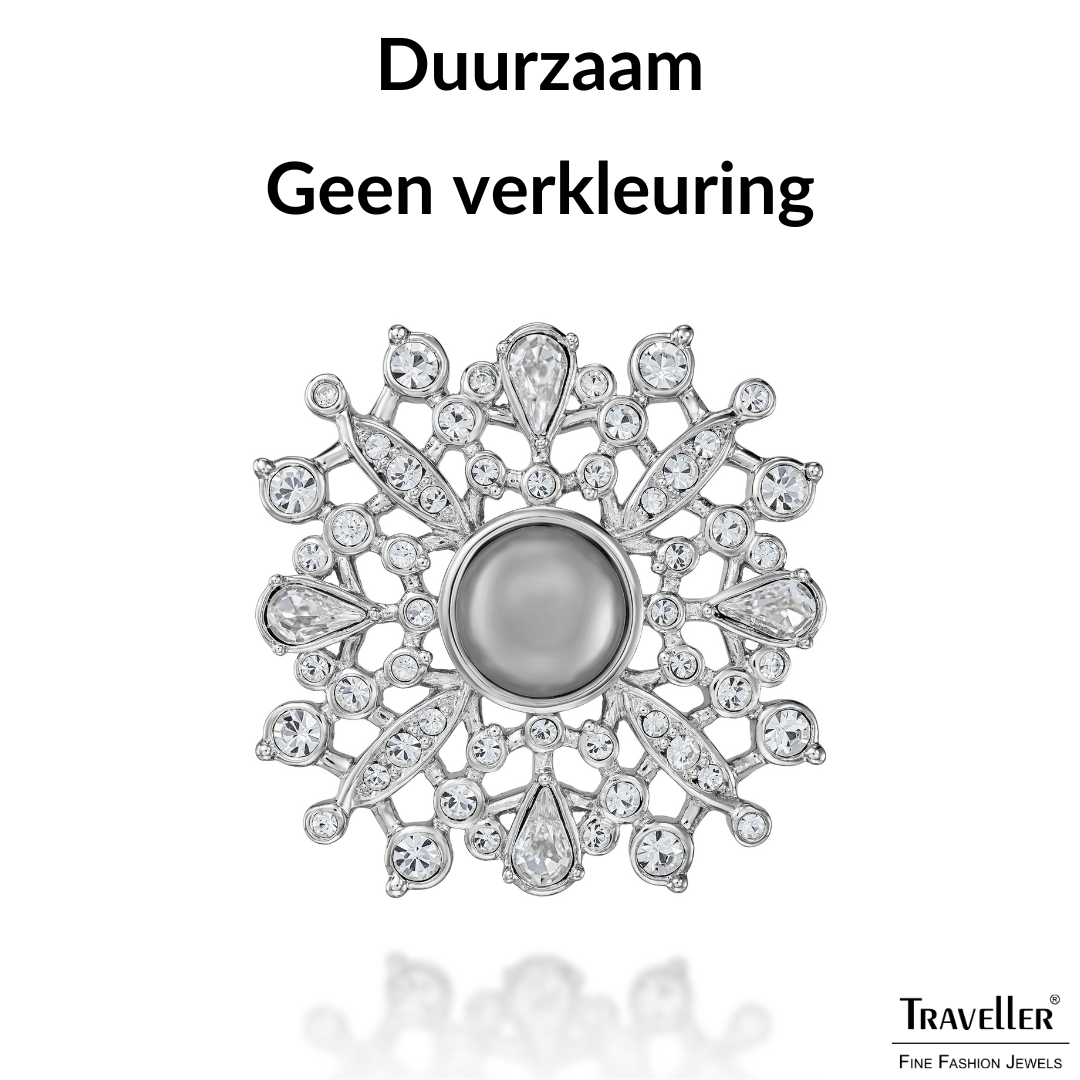 Een chique, schitterende broche van Traveller met een stralend design. De broche heeft de vorm van een zon met gedetailleerde stralen. De stralen bestaan uit schitterende Preciosa kristallen fijn omlijst en aaneengesloten door zilverkleurige verbindingsstukjes. Het hart van de zon bestaat uit de helft van een glanzende grijze parel - een hoogwaardige imitatieparel afkomstig uit Mallorca, een eiland dat bekendstaat om zijn parels. De bevestiging gebeurt middels een speld met veiligheidsslotje. De geplatineerde broche heeft een diameter van 33 millimeter en weegt 9,65 gram.
