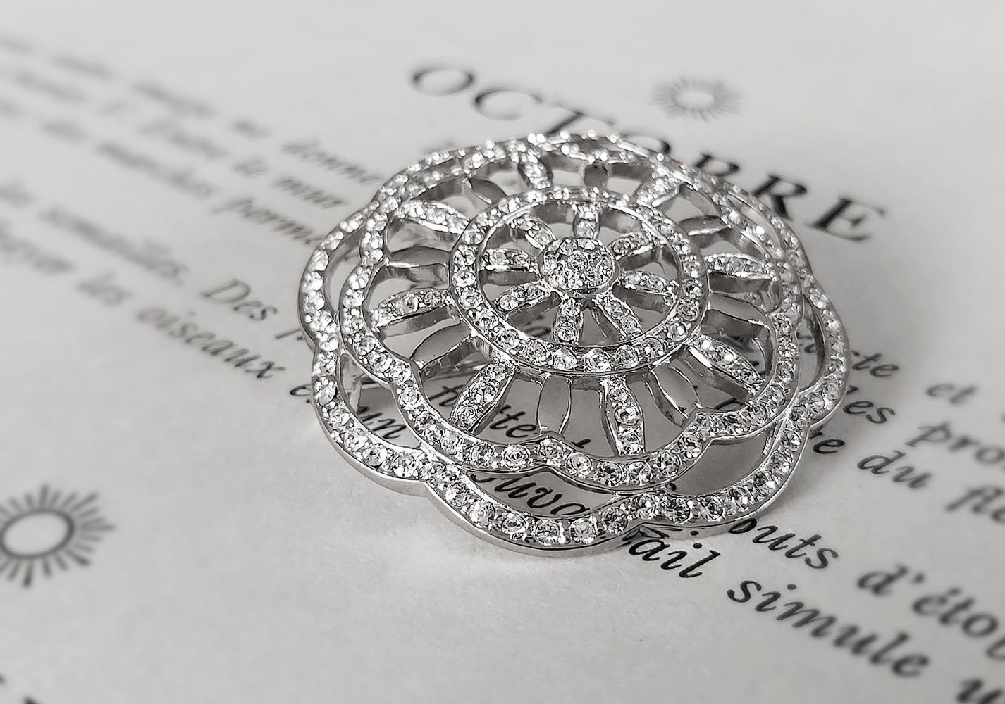 Deze op de barok geïnspireerde broche van Traveller laat symmetrie in haar grootste schoonheid zien. De geplatineerde broche heeft de vorm van een bloem en is vrijwel volledig bezaaid met kristallen van Preciosa. De broche heeft een diameter van 36 millimeter en weegt 9 gram. Deze broche is verpakt in een geschenkverpakking van milieugecertificeerd materiaal!