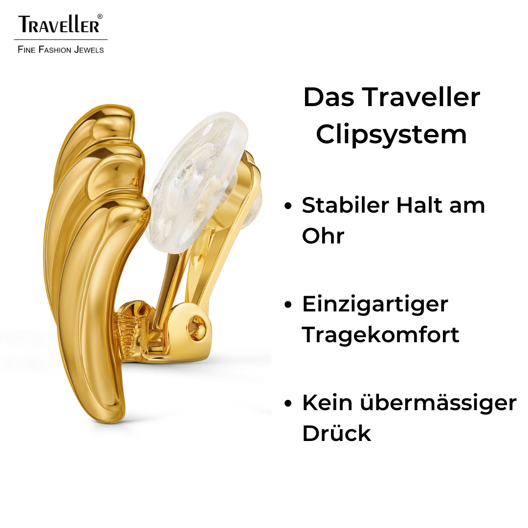 Deze oorclips van Traveller zijn hebben een eenvoudig maar opvallend design! De oorclips bestaan uit 3 glanzend gouden banden, de oorbellen zijn verguld met 22 karaat goud. Per stuk wegen de oorbellen 3,5 gram, ze zijn 17 millimeter lang en 10 millimeter breed. Dankzij het unieke sluitingssysteem van Traveller zijn de clips zeer comfortabel, licht en veilig om te dragen.