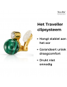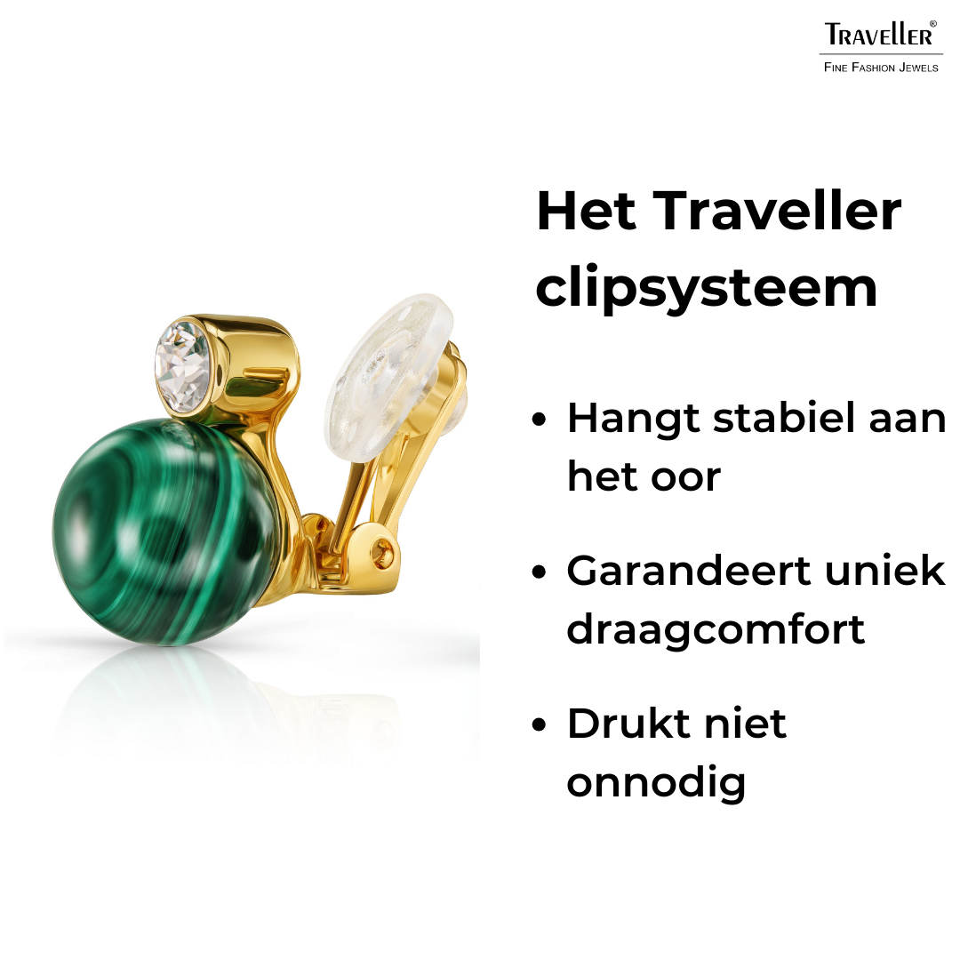 De klassieke ronde oorbel van Traveller combineert harmonie met elegantie. Deze vergulde clips bevatten een echte prachtig gemeleerde Malachietsteen met een diameter van 10 millimeter, daarboven fonkeld een kristal van Peciosa. Malachiet is een natuurproduct hierdoor kan de kleur op de foto afwijken van de kleur oorbel die u ontvangt, elke steen is uniek en ziet er daardoor een klein beetje anders uit. Dankzij het unieke sluitingssysteem van Traveller zijn deze oorclips zeer comfortabel, licht en veilig om te dragen.