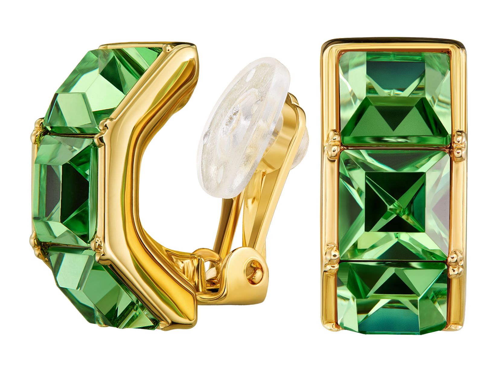 Elegante kristallen in een strak design vormen deze vrolijke oorbel. Op deze oorclips van Traveller is een rij geplaatst van hoogwaardige groene kristallen van Preciosa. De vergulde oorbellen zijn 16 x 8 millimeter groot en wegen per stuk 4 gram. Dankzij het unieke sluitingssysteem van Traveller zijn deze oorclips zeer comfortabel, licht en veilig om te dragen.