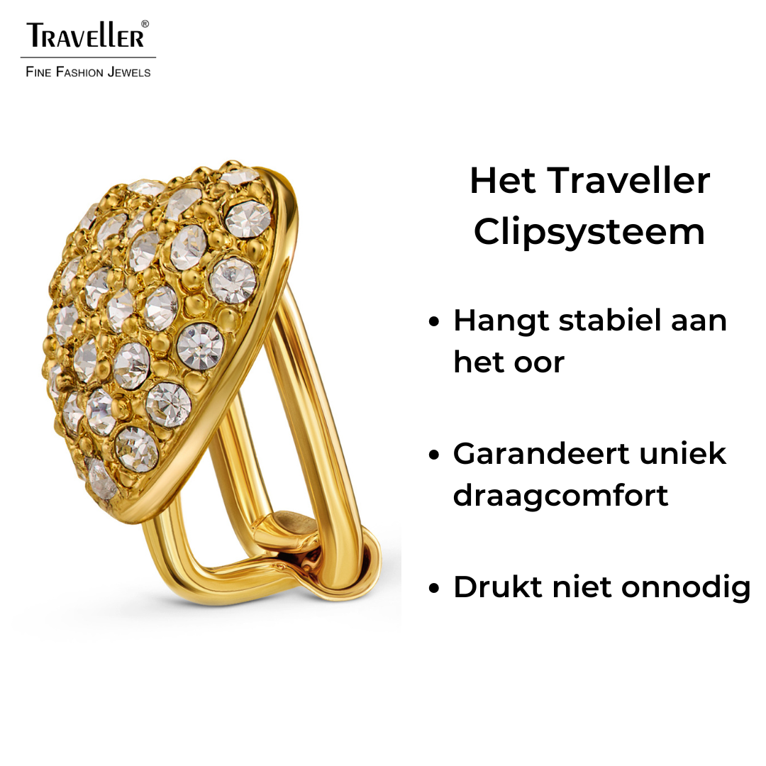 Deze oorclips van Traveller zijn perfect als uitdrukking van liefde - voor een ander of voor jezelf. De goudkleurige oorclips bestaan uit een glanzend gouden hartje bezaaid met schitterende kristallen van Preciosa. Het hartje is opvallend maar niet opzichtig, een prachtig liefdessymbool. De oorclips zijn met 22 karaat goud verguld, hebben een afmeting van 11 x 10 millimeter en wegen per stuk slechts 1,6 gram. Dankzij het unieke sluitingssysteem van Traveller zijn deze oorclips zeer comfortabel, licht en veilig om te dragen.