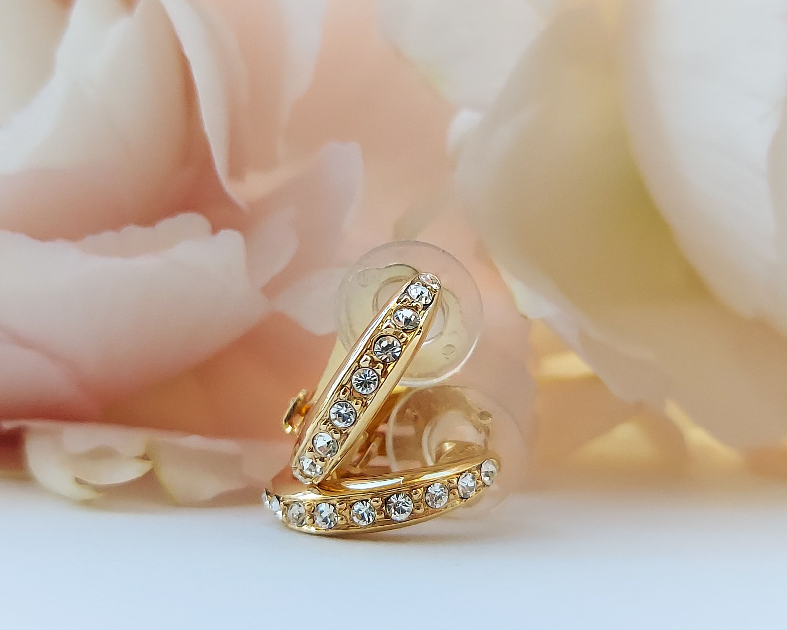 Een stijlvol, tijdloos en fonkelend paar oorbellen van Traveller. Deze halve oorringen, verguld met 22ct goud (kernmateriaal metaal), zijn bezaaid met kristallen van Preciosa. De oorbellen zijn 15 x 3 millimeter groot en wegen per stuk 2 gram. Dankzij het unieke sluitingssysteem van Traveller zijn deze oorclips zeer comfortabel, licht en veilig om te dragen.
