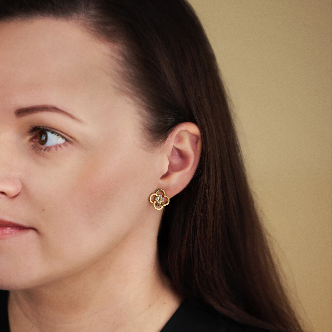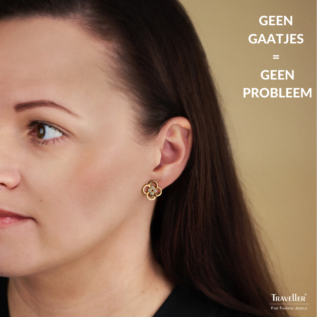 Deze oorbellen van Traveller zijn subtiel maar zeker niet onopvallend. De oorclips in de vorm van een bloem bestaan uit 4 goudkleurige bloembladranden met als hart 4 kristallen van Preciosa. De oorbellen zijn volledig verguld met 22 karaat goud, hebben een diameter van 13 millimeter en wegen slechts 1,75 gram per oorbel. Dankzij het unieke sluitingssysteem van Traveller zijn deze oorclips zeer comfortabel, licht en veilig om te dragen.