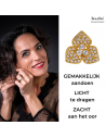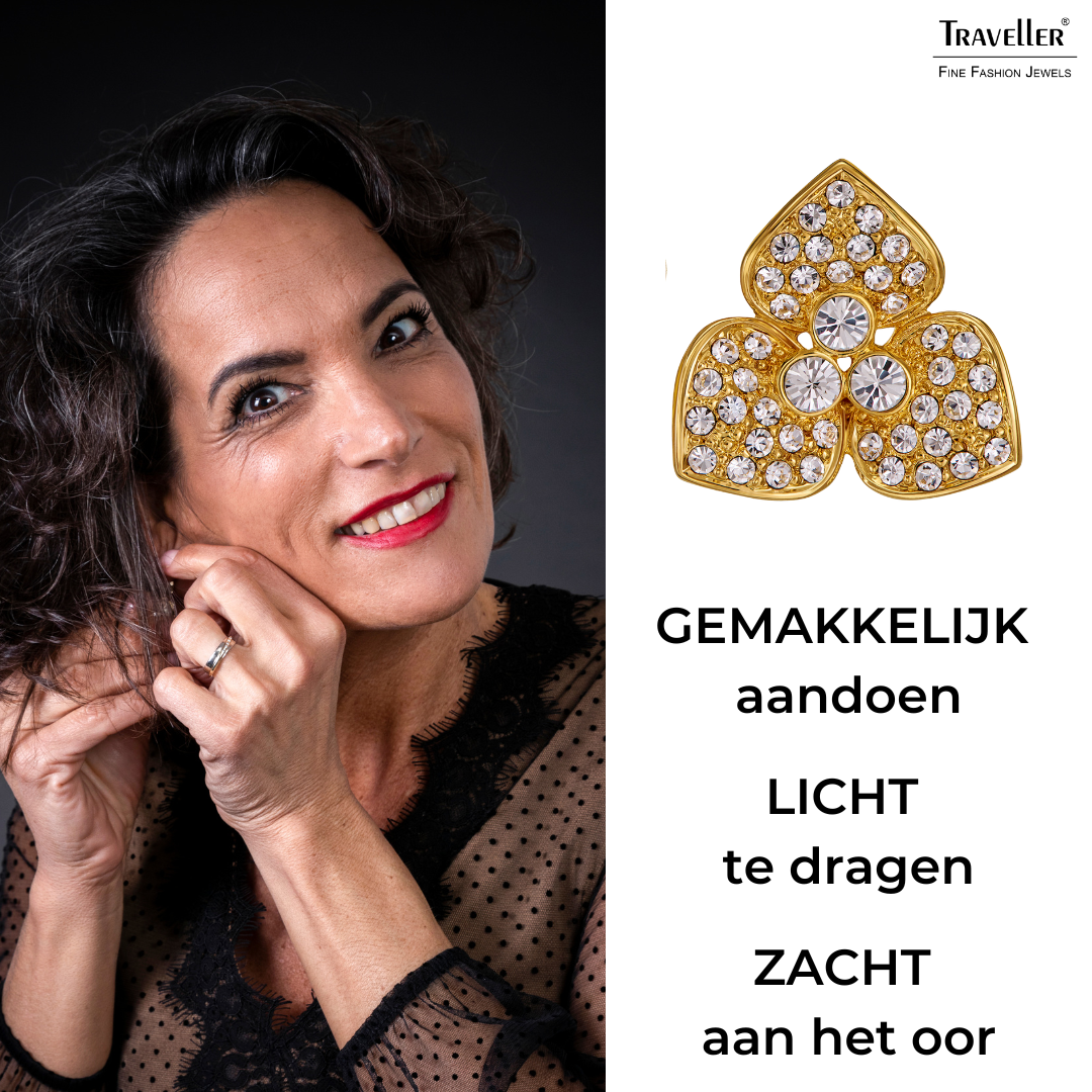 Sparkle & shine: dat is de beste omschrijving voor deze schitterende oorbellen van Traveller. De goudkleurige oorclips zijn geheel verguld met 22 karaat goud en hebben de vorm van een bloem. De drie blaadjes van deze bloem zijn bezaaid met kristallen van Preciosa en het hart bestaat uit 3 grotere Preciosa kristallen.