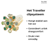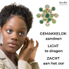 Deze fonkelende, fleurige oorclips van Traveller hebben de vorm van een bloemetje. De met 22 karaat goud vergulde oorbellen (kernmateriaal: metaal) zijn bezaaid met kristallen van Preciosa in verschillende groentinten. De oorbellen hebben een diameter van 17 millimeter en wegen per stuk slechts 4 gram. Dankzij het unieke sluitingssysteem van Traveller zijn de clips zeer comfortabel, licht en veilig om te dragen.
