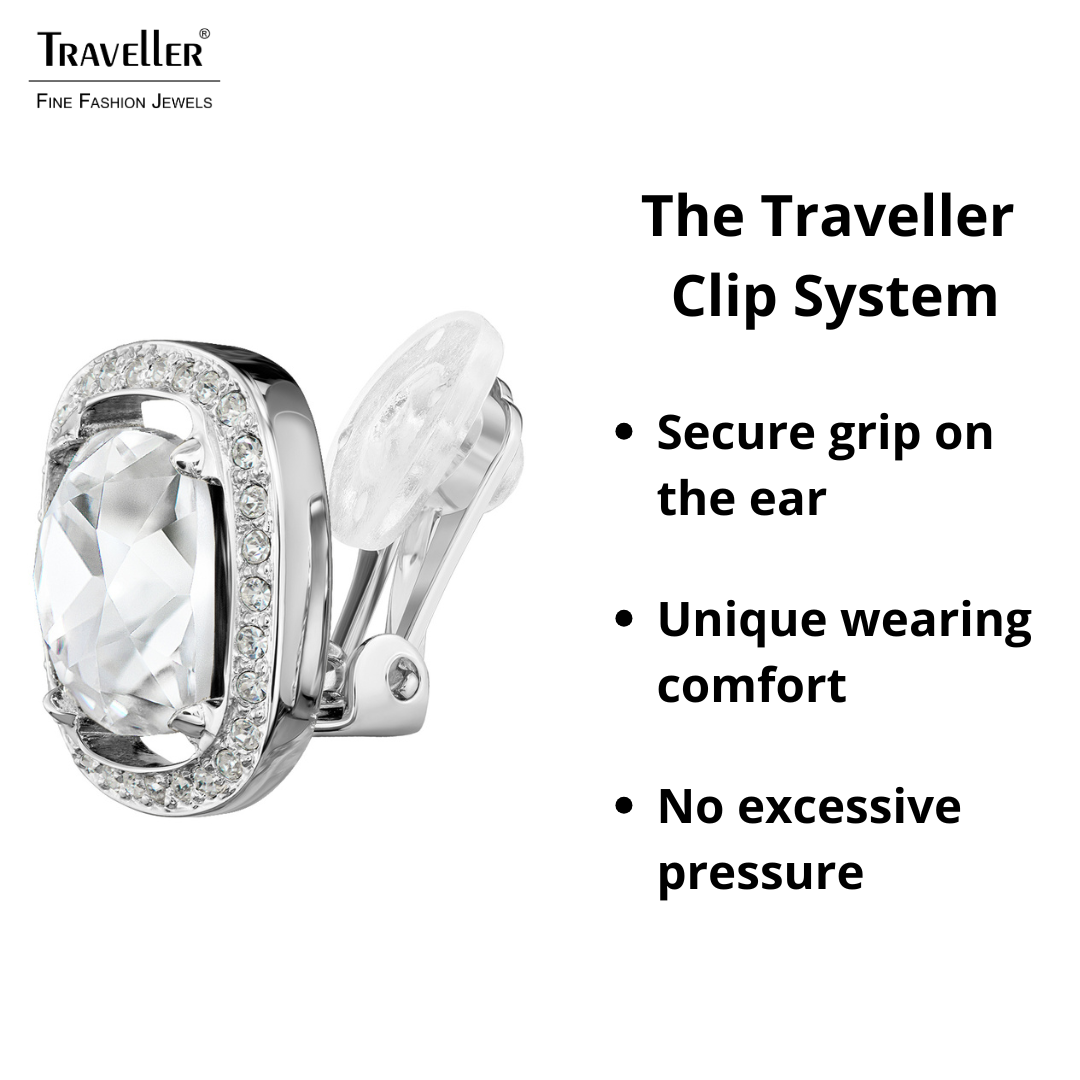 Een paar chique en sprankelende clip oorbellen van Traveller. Rondom het grote kristal is een randje aangebracht met kleine kristallen. Deze Preciosa kristallen worden gemaakt van de beste grondstoffen uit de Tsjechische streek en zijn ongeƫvenaard in kwaliteit en glans. Elke steen wordt zorgvuldig met de hand bewerkt met eeuwenoude glasblaastechnieken en gemaakt van natuurlijk Boheems zand, dat bekend is om zijn rijkdom aan silica en siliciumoxide. Dankzij het lichte gewicht, 4 gram per stuk, en het unieke sluitingssysteem van Traveller, zijn de clipoorbellen zeer comfortabel, licht en veilig om te dragen. Deze clip oorbellen zijn verpakt in een milieugecertificeerde geschenkverpakking!