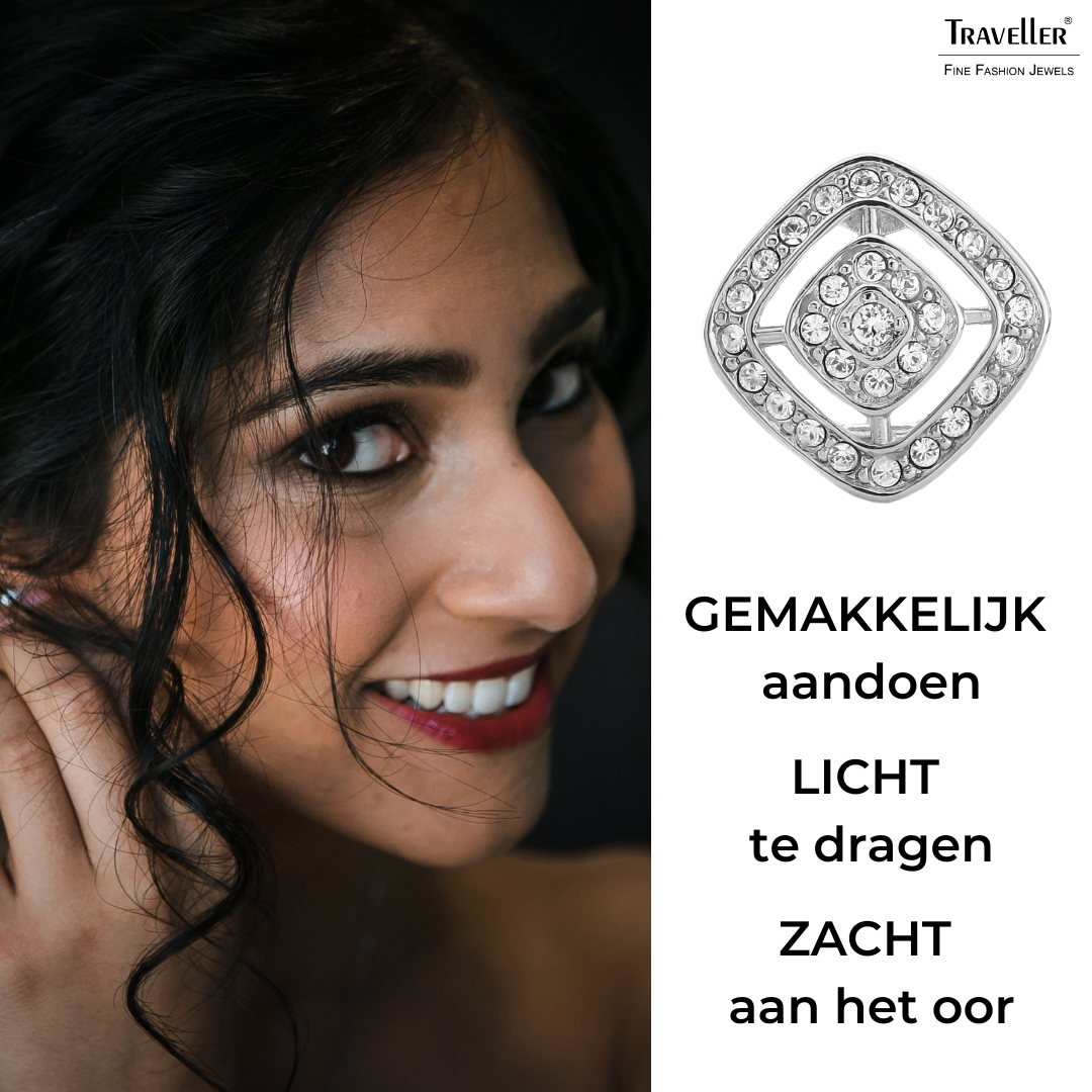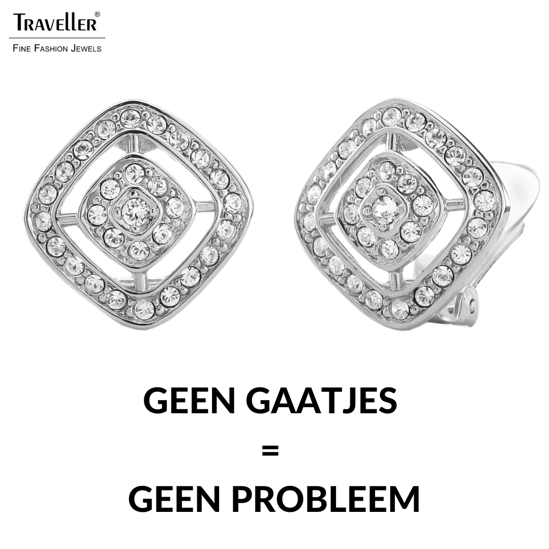 Traveller Clip Oorbellen - Zilverkleurig - Kristallen - Vierkant - Ø 17mm - Geplatineerd