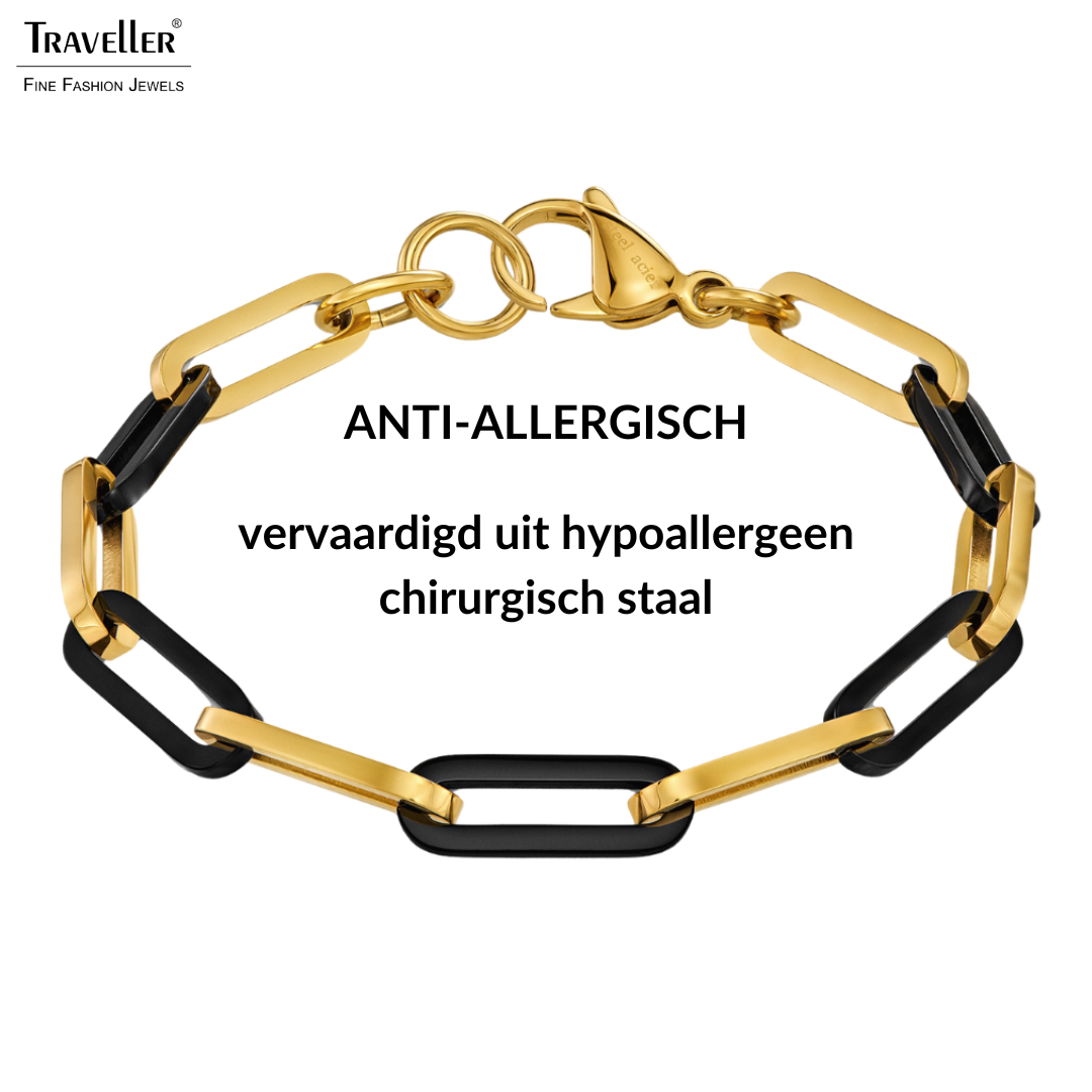 Een classy design van Traveller, chique en energiek. Deze edelstalen armband bestaat uit zwart en goudkleurige schakels, om en om hangen de zwart en goudkleurige schakels aan elkaar. De armband heeft een lengte van 21 centimeter, is 0,7 centimeter breed en weegt 15 gram.