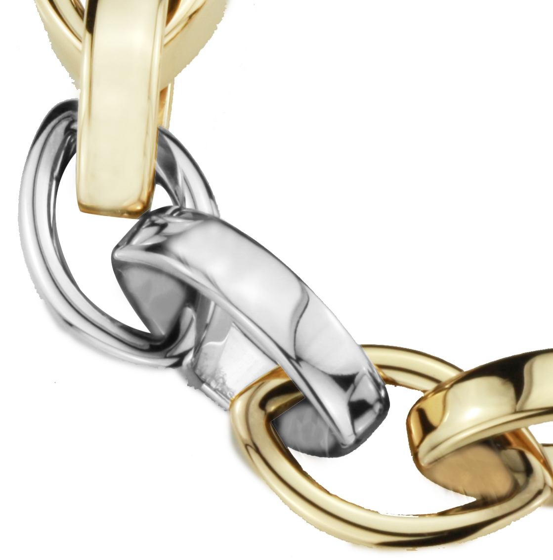 Een strak design van Traveller, met speels effect en een chique uitstraling. De edelstalen armband bestaat uit zilver- en goudkleurige schakels die aan elkaar hangen. De armband is 21 centimeter lang. Maak het helemaal compleet met de bijpassende ketting!