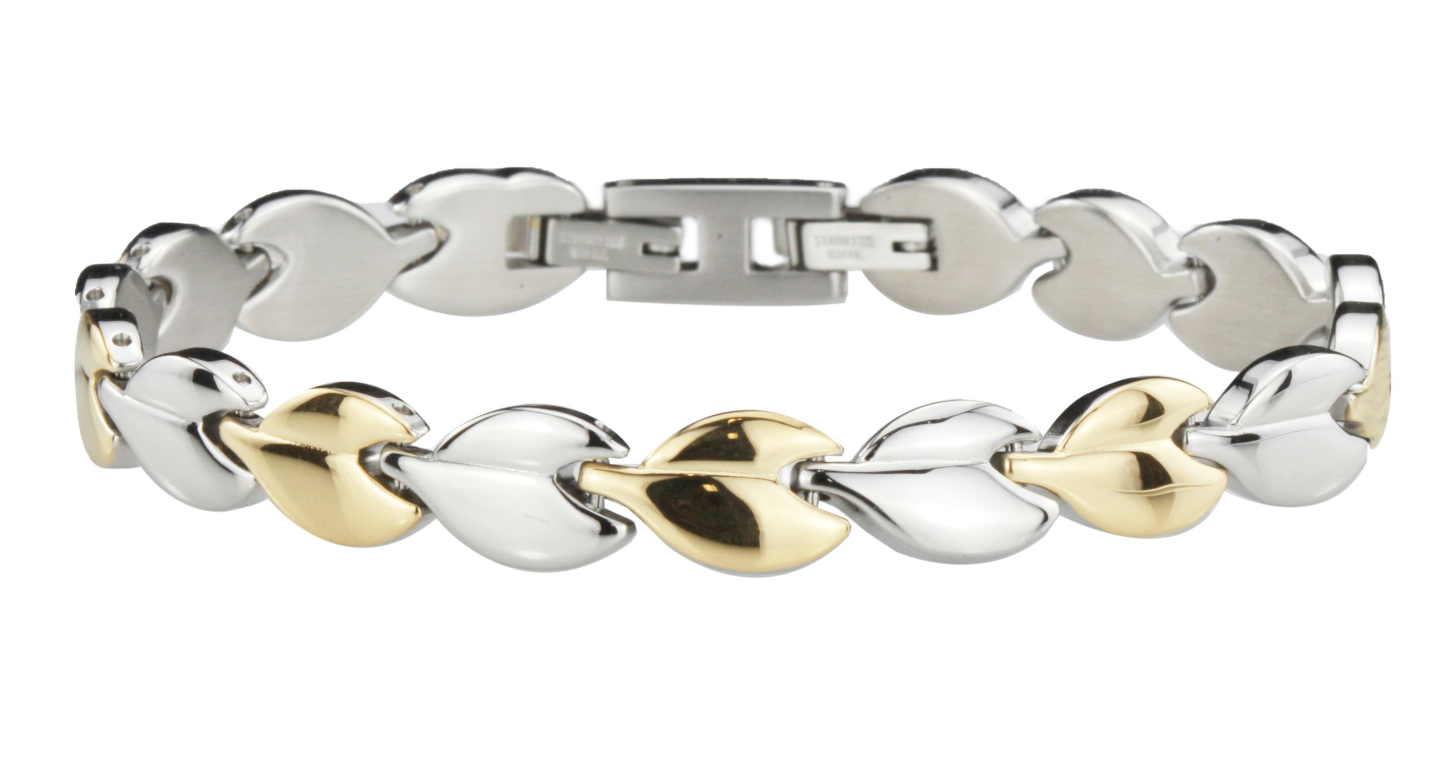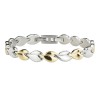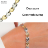 Deze edelstalen armband van Traveller is lieflijk en speels, hier wordt iedereen gelukkig van! De armband bestaat uit allemaal kleine, in elkaar geschoven hartjes, om en om goudkleurig en zilverkleurig. De goudkleurige hartjes zijn verguld met 22 karaat goud. De armband heeft een lengte van 19 centimeter, een breedte van 0,8 centimeter en weegt 28 gram.