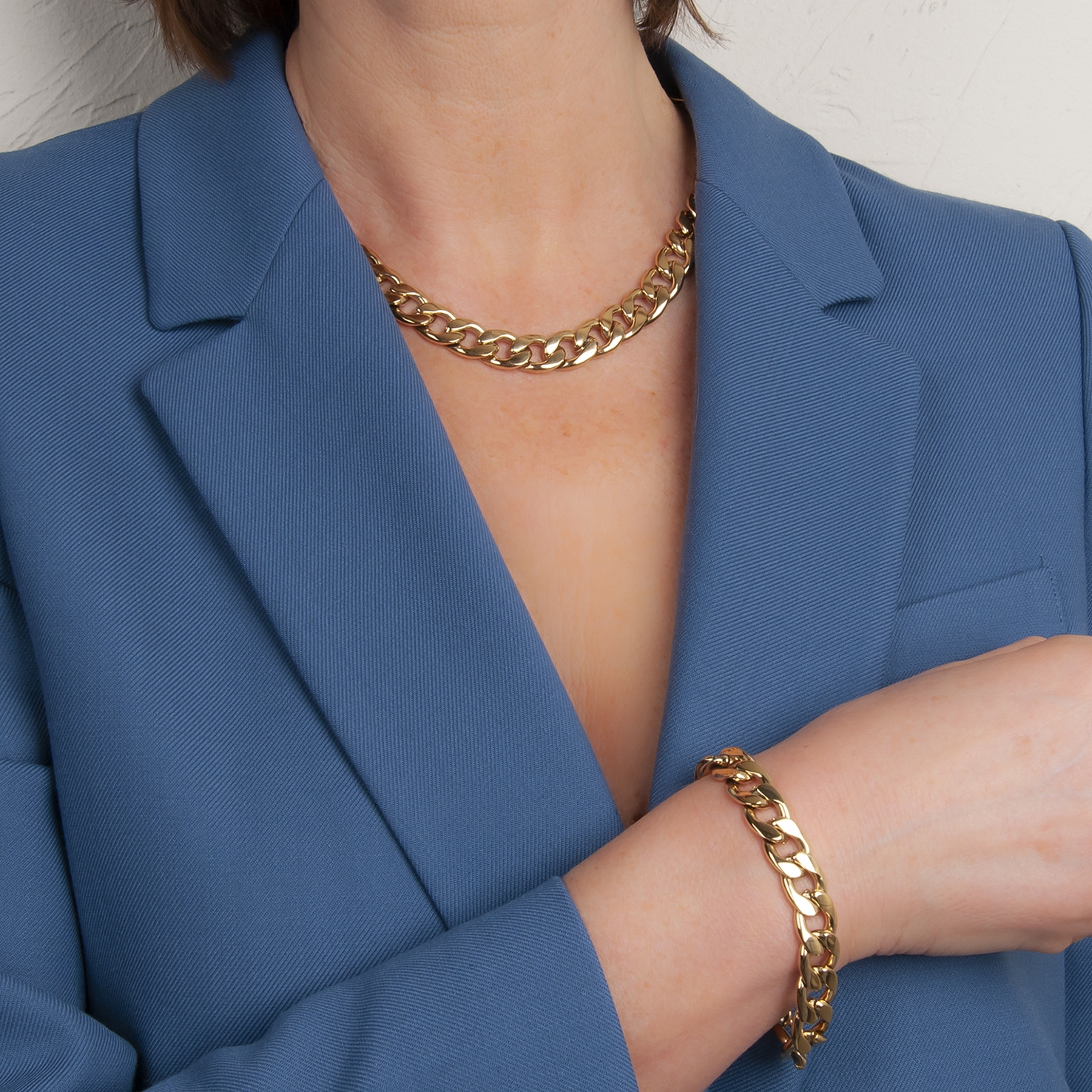 Deze armband maakt iedere outfit compleet op de meest chique manier. De goudkleurige edelstalen schakelarmband is 19 centimeter lang en heeft een tijdloos, elegant design. Maak het helemaal compleet met de bijpassende ketting.