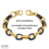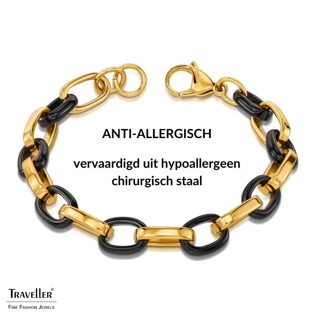 Klassiek chique gecombineerd met modieus opvallend is wat deze armband van Traveller is! De edelstalen armband bestaat uit zwarte en goudkleurige ovale schakels, van 14 bij 10 millimeter, die om en om in elkaar hangen. De armband is 21 centimeter lang en weegt circa 27,4 gram. Maak het helemaal af met de bijpassende ketting (181315)!
