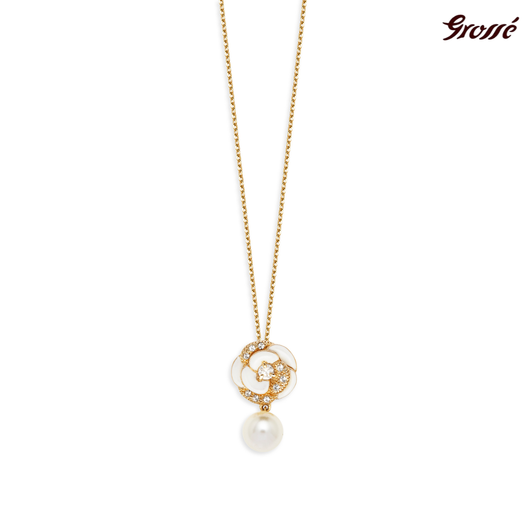 De Camelia is een prachtige bloem uit Azië die vooral in Japan en China een grote symbolische waarde heeft. De bloem staat voor zuiverheid en perfectie. Dit heeft Grossé geprobeerd te evenaren met de prachtige collectie Blanc Camelia. Aan deze volledig vergulde ketting hangt een prachtig vormgegeven goud met Camelia (Japanse roos) met kristallen met daaronder een parel. De ketting meet 38 centimeter en heeft een verlengstuk van 5 centimeter zodat deze op de gewenste maat vastgemaakt kan worden, de ketting weegt 4,5 gram.