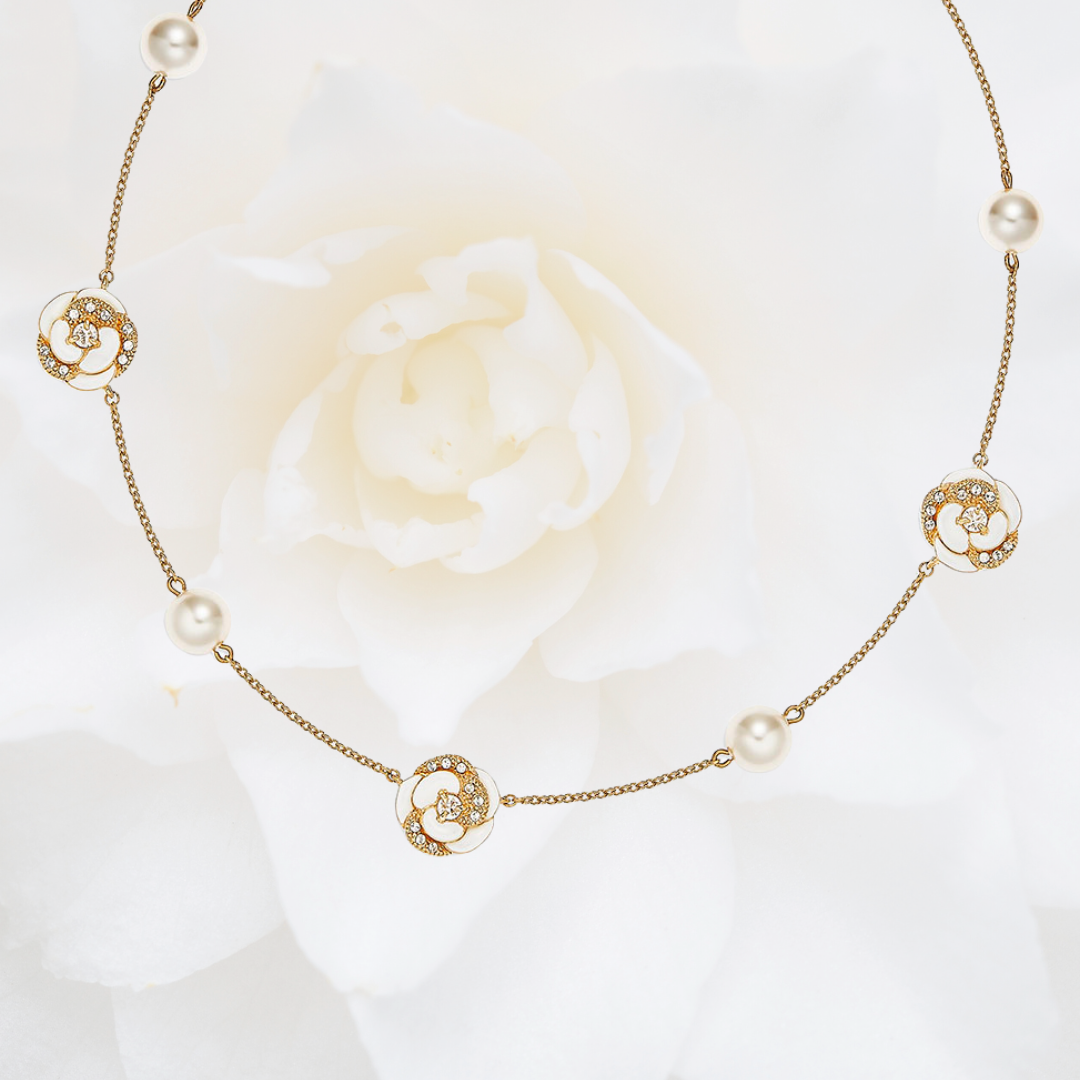De Camelia is een prachtige bloem uit Azië die een grote symbolische waarde heeft, vooral in Japan en China. De bloem staat voor zuiverheid en perfectie. Grossé heeft geprobeerd dit te evenaren met de prachtige Blanc Camelia collectie. Aan deze volledig vergulde ketting hangen om en om prachtig vormgegeven goud met witte Camelia's (Japanse roos) en glanzende parels. De bloemen hebben een kristallen hart en ook op de gouden delen van de bloemblaadjes zijn kristallen verwerkt. Het collier meet 38 centimeter en heeft een verlengstuk van 5 centimeter zodat het op de gewenste maat kan worden vastgemaakt, het collier weegt 11 gram.