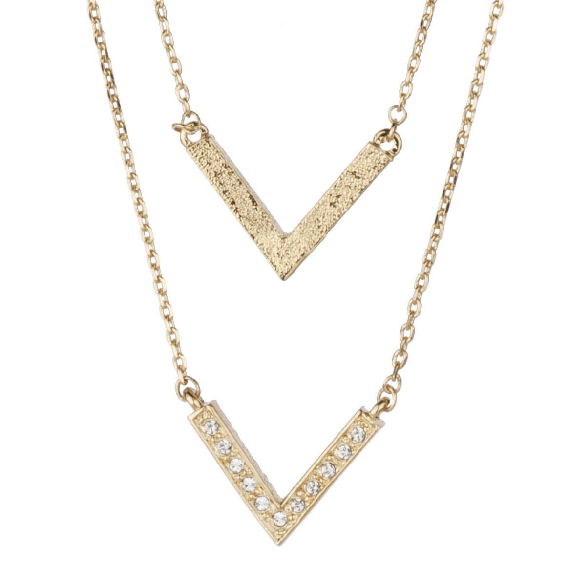 Een dubbele ketting die nog steeds rustig oogt! Dat is deze ketting van Osira, duidelijk aanwezig maar niet overheersend. De ketting bestaat uit twee vergulde snoeren met aan beide een vergulde V. De V aan het kortste snoer heeft een ruwer oppervlak, de V aan de lange ketting is bezet met witte Preciosa kristallen. De ketting heeft een lengte van 38 centimeter en heeft 2 verlengstukken van elk 3 centimeter zodat deze op verschillende lengtes gedragen kan worden.