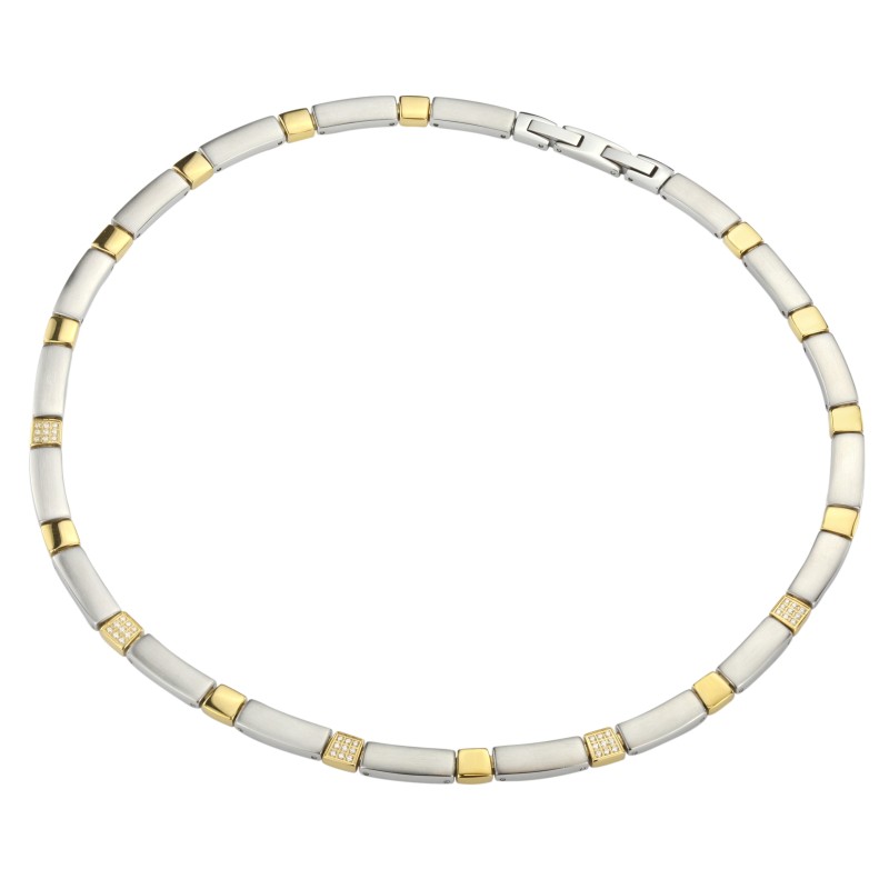 Traveller Dames Ketting - Edelstaal - Bicolor - Mat Zilverkleurig & Verguld - Zirkonia - 47 cm Lang - 6 mm Breed