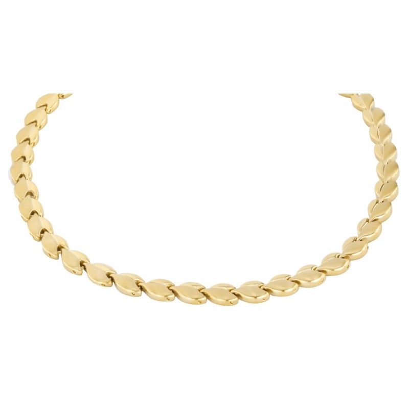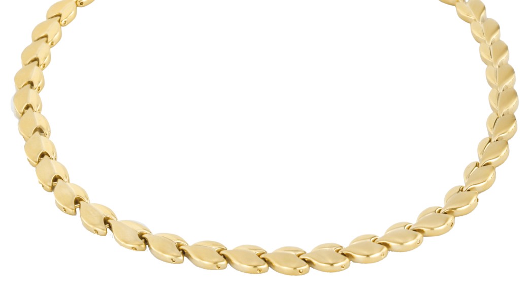 Less is more, deze ketting is most! De ketting bestaat uit een eenvoudig design van schakeltjes in de vorm van blaadjes. Doordat een stukje van ieder blaadje glimmend is en het grootste deel mat, heeft deze ketting net iets meer! De ketting is mooi om zo te dragen, maar ook heel mooi om te combineren met de bijpassende armband. (#180517) De ketting heeft een lengte van 45 cm.