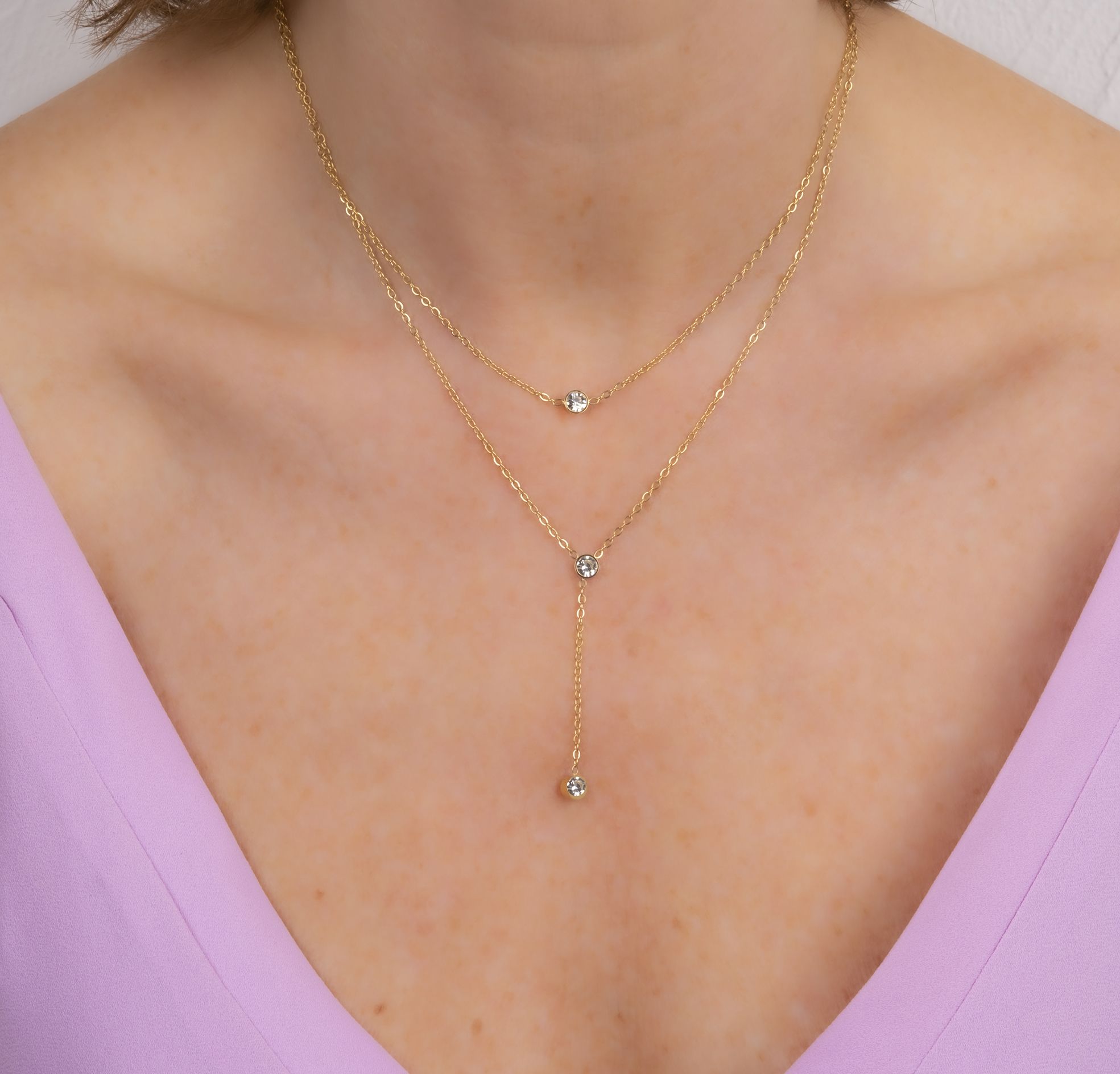 Een dubbele ketting die niet te druk is! Het snoer van deze subtiele edelstalen ketting is verstelbaar, zodat u zelf kunt kiezen op welke lengte u hem wil dragen (38 of 42 centimeter en weegt 4 gram. De ketting bestaat uit twee vergulde snoeren met aan beide, in het midden, een zirkonia. Onderaan de langste ketting hangt nog een zirkonia.