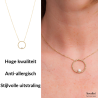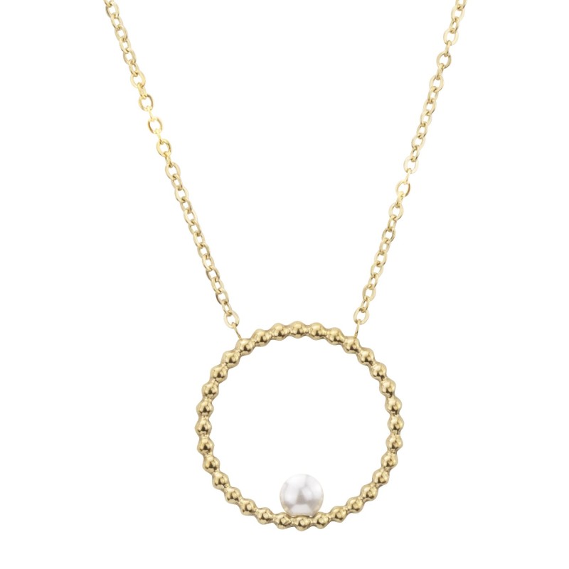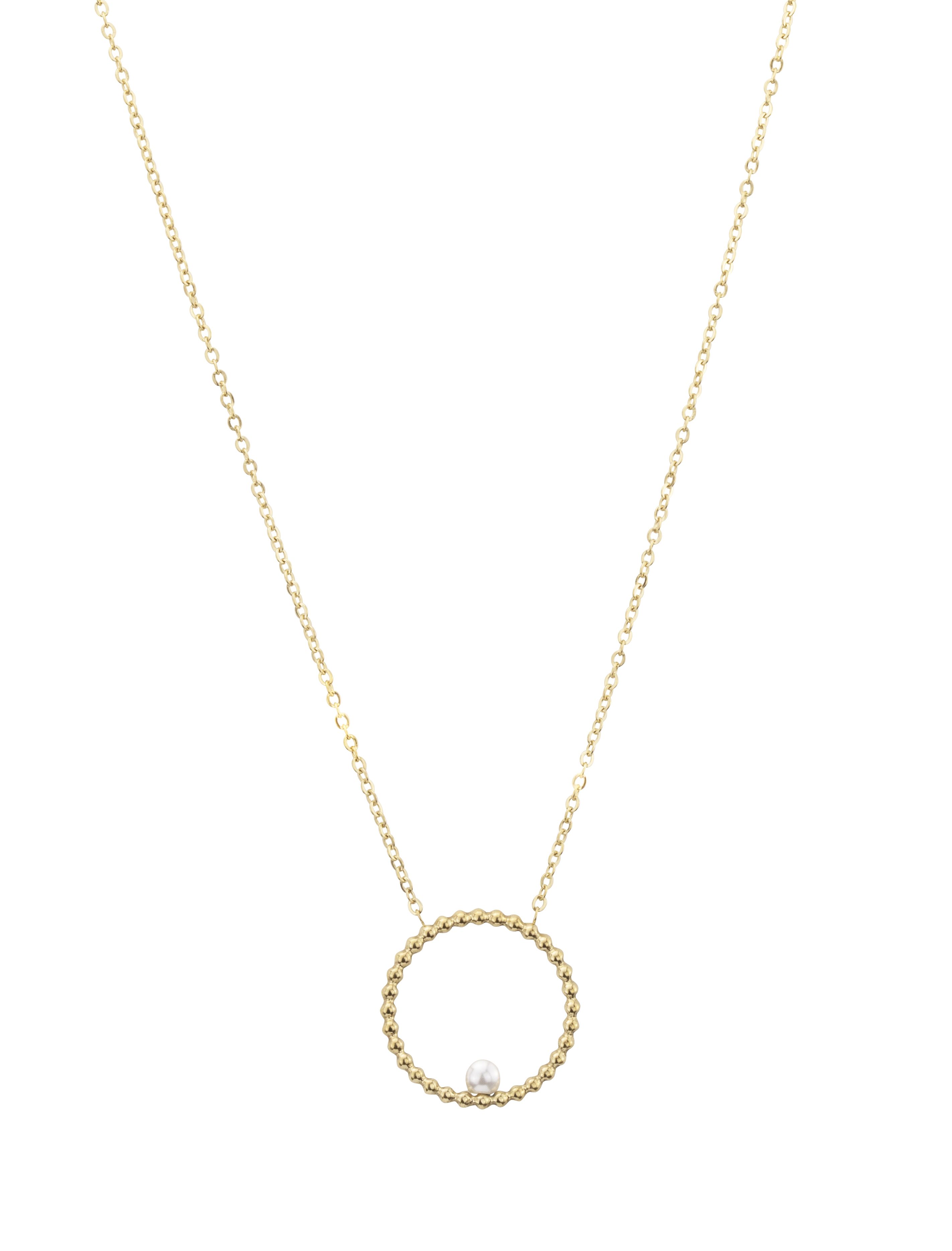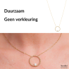 Een uniek design van Traveller. Deze vergulde ketting heeft een hanger met bolstructuur in de vorm van een cirkel met daarin een zoetwaterparel. De hanger heeft een diameter van 2,5 centimeter, de ketting weegt 4 gram. Het snoer van de edelstalen ketting is verstelbaar, zodat u zelf kunt kiezen op welke lengte u hem wil dragen (45 of 50 centimeter).