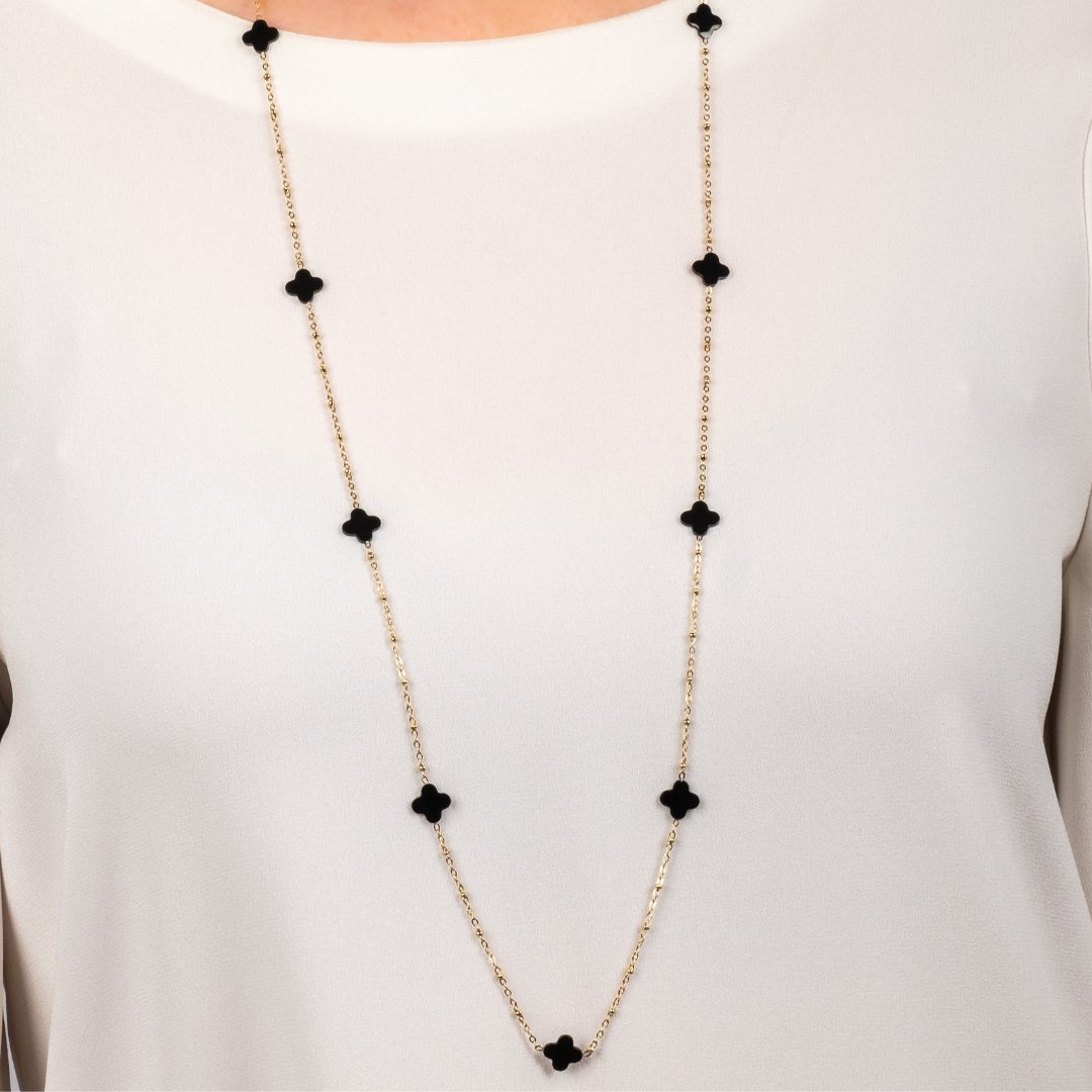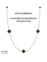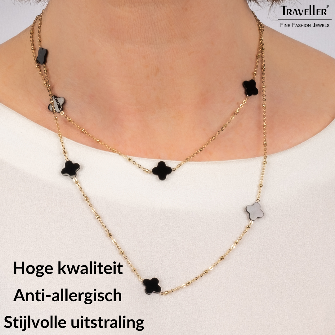 Traveller Dames Ketting - Edelstaal - Verguld - Zwart - Bloem - 10mm - 90 cm