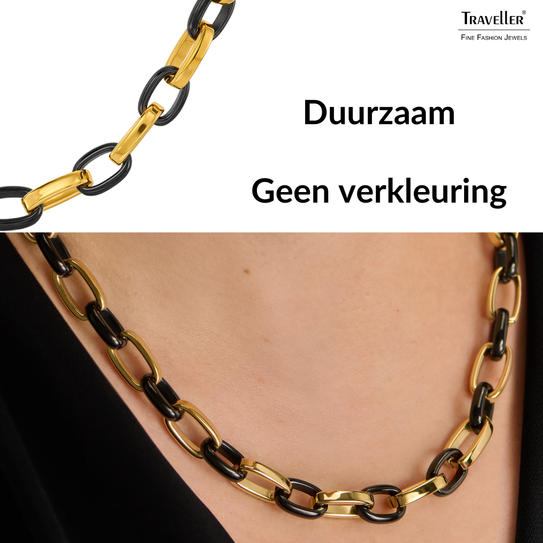 Klassiek chique gecombineerd met modieus opvallend is wat deze ketting van Traveller is! De edelstalen ketting bestaat uit zwarte en goudkleurige ovale schakels, van 14 bij 10 millimeter, die om en om in elkaar hangen. De ketting is 47 centimeter lang en weegt circa 66,8 gram. Maak het helemaal af met de bijpassende armband (181316)!