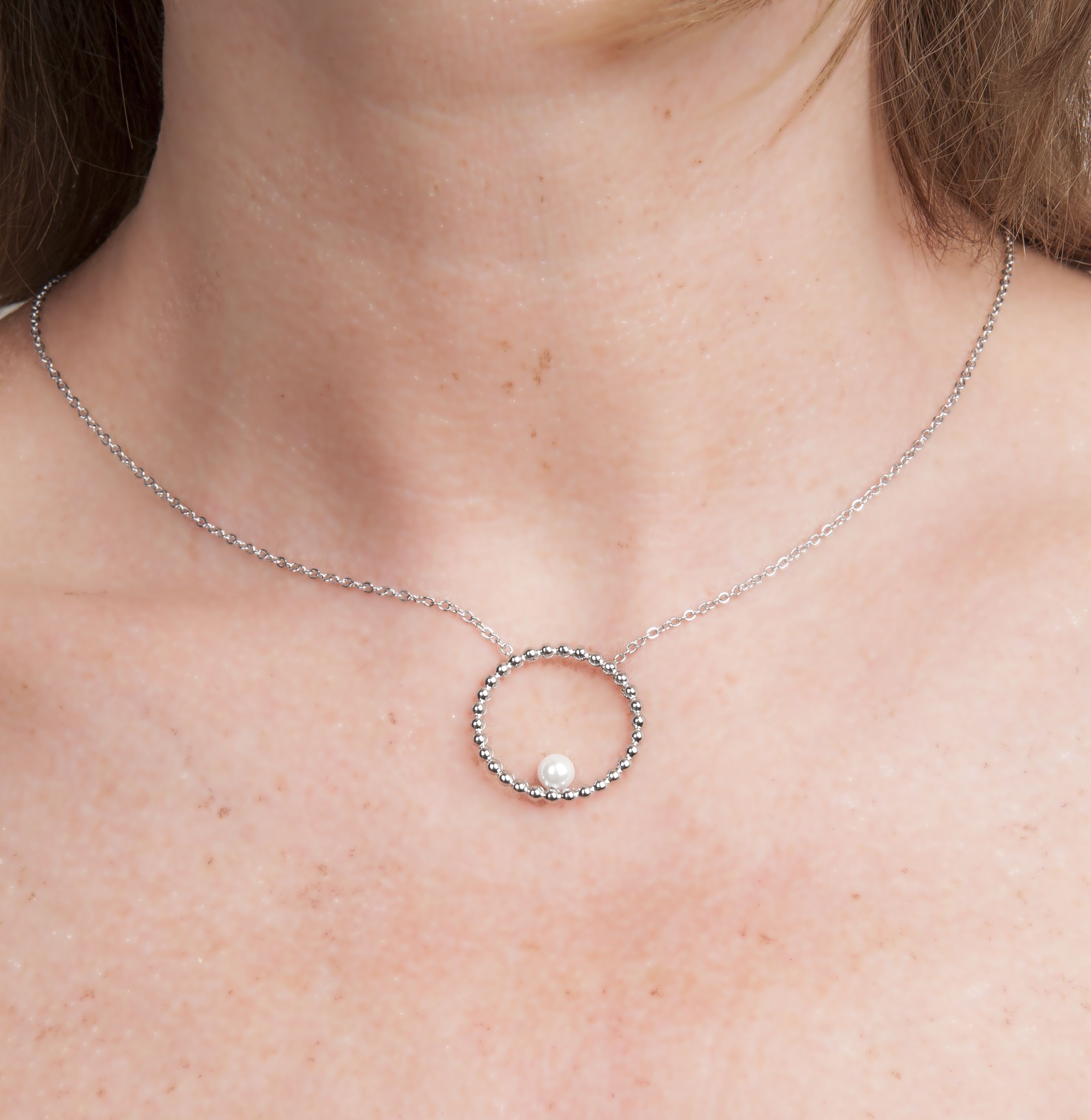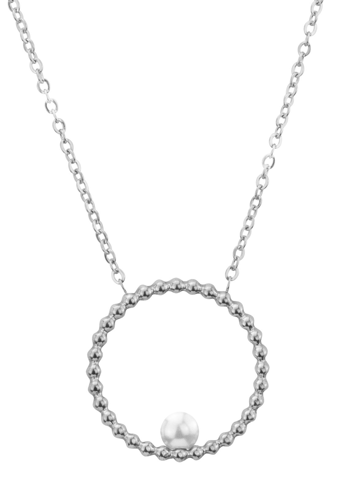 Een uniek design van Traveller. De edelstalen ketting heeft een hanger met bolstructuur in de vorm van een cirkel met daarin een zoetwaterparel. De hanger heeft een diameter van 2,5 centimeter, de ketting weegt 4 gram. Het snoer van de zilverkleurige ketting is verstelbaar, zodat u zelf kunt kiezen op welke lengte u hem wil dragen (45 of 50 centimeter).