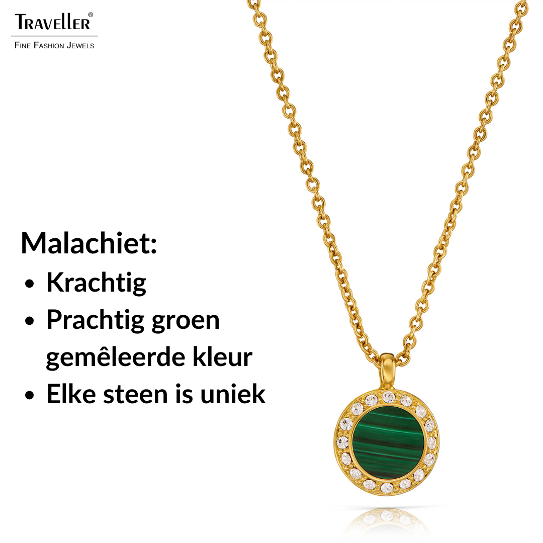Deze subtiele ketting van Traveller combineert een prachtige echte malachiet steen met kristallen van Preciosa. Aan de met 22 karaat goud vergulde ketting hangt een echte gemeleerde Malachietsteen met een diameter van 9 millimeter, daar omheen fonkelen kristallen van Preciosa. Malachiet is een natuurproduct hierdoor kan de kleur op de foto afwijken van de kleur hanger die u ontvangt, elke steen is uniek en ziet er daardoor een klein beetje anders uit. De ketting heeft een lengte van 40 centimeter en 2 verlengstukjes van elk 4 centimeter, zo kan de ketting op de gewenste lengte gedragen worden.