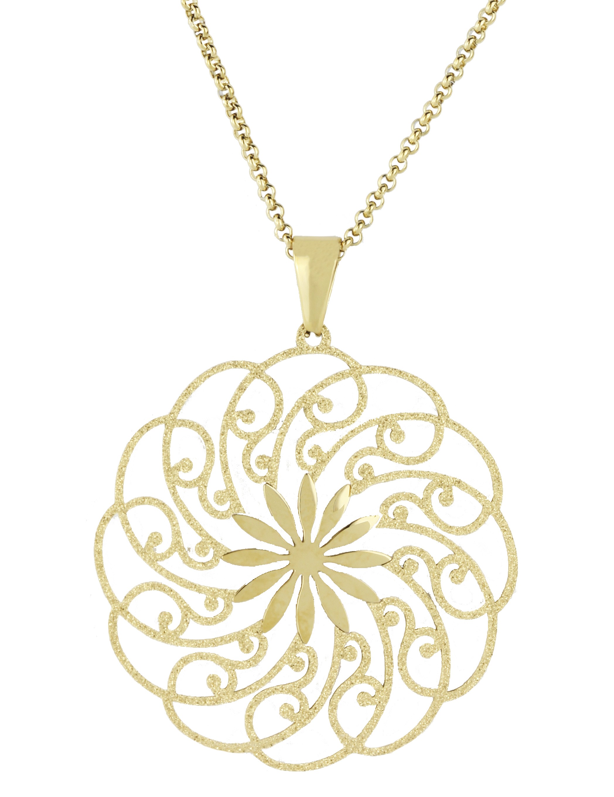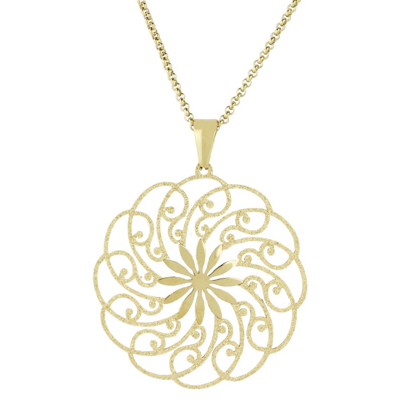Chique en charmant, sprankelend en speciaal. Dat alles is deze ketting van Traveller! Aan het verstelbare snoer (50 tot maximaal 60 centimeter) hangt een opvallende hanger met een hanger van 4,5 centimeter met in het midden een bloem en sierlijke lijnen daaromheen. Deze buitenste rand heeft door zijn slijpwijze een bijzonder glittereffect. Met 12 gram is deze ketting licht van gewicht.