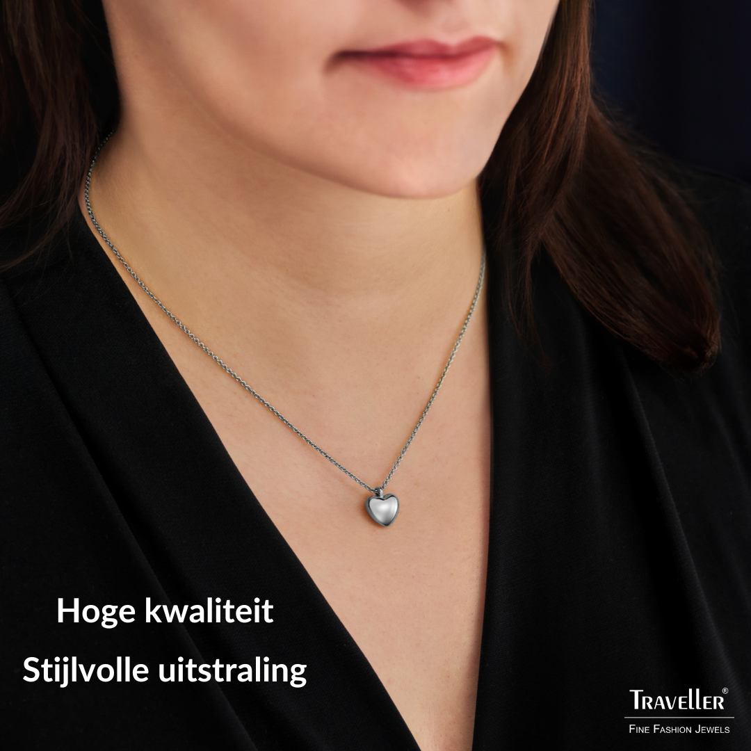 Deze ketting van Traveller is perfect als uitdrukking van liefde - om cadeau te doen aan een ander of jezelf. Aan de zilverkleurige verstelbare ketting (38 + 3 + 3 centimeter) hangt een hangertje met een glanzend hartje. Met een diameter van 10 millimeter is het hangertje subtiel maar opvallend, een prachtig liefdessymbool. Het hangertje is net als de ketting volledig geplatineerd, samen weegt dit 3,8 gram.