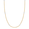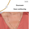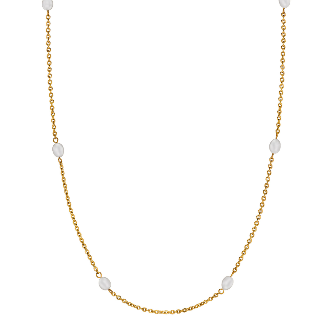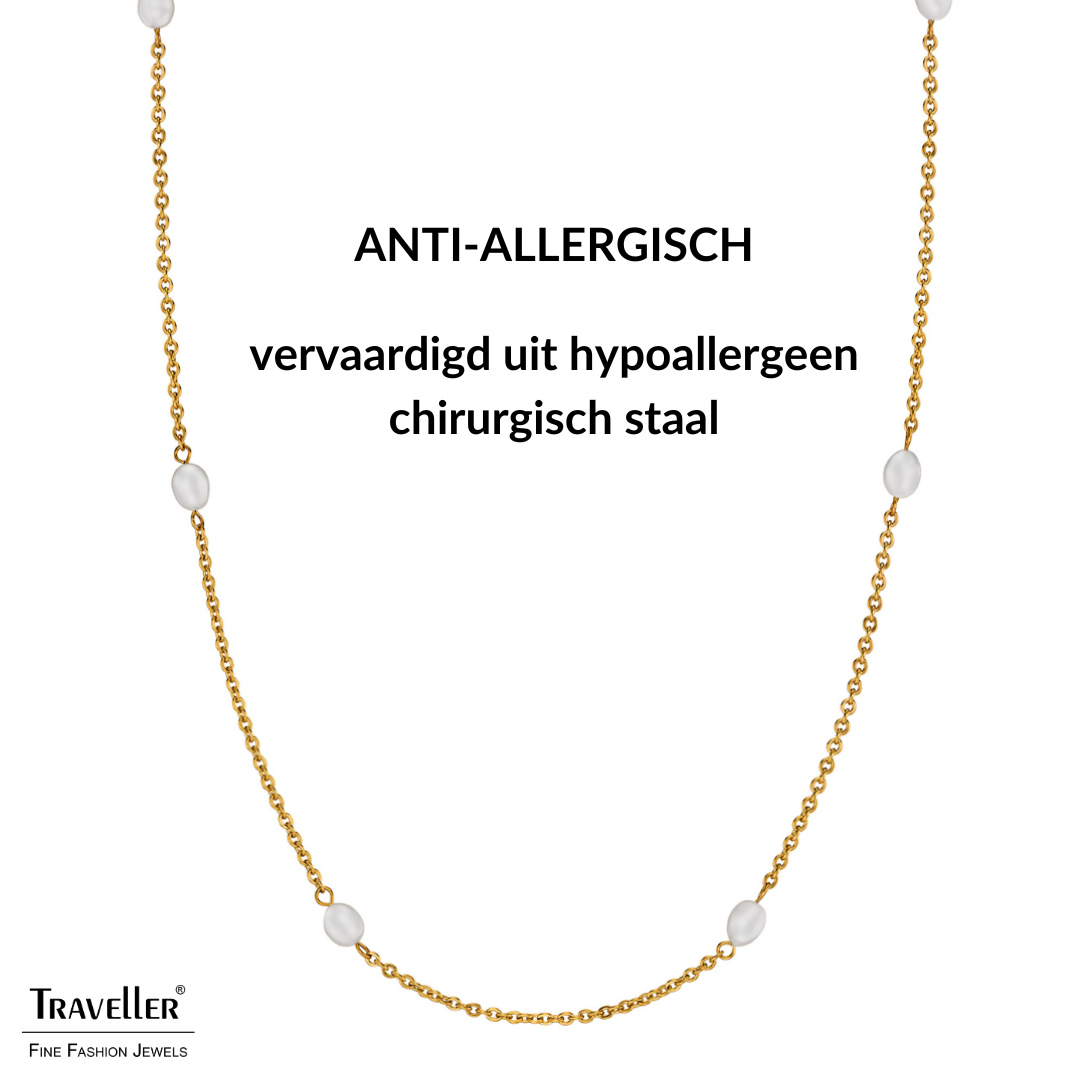Een vleugje chique of juist wat speelsheid aan je outfit toevoegen doe je met deze klassieke, bijzondere ketting van Traveller! Aan de 90 centimeter lange, vergulde ketting zijn op 10 plekken prachtige ovalen zoetwater parels toegevoegd. De parels zijn 10 x 6 millimeter groot, de ketting weegt zo'n 12 gram.