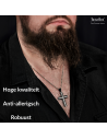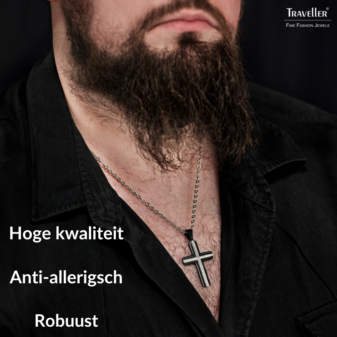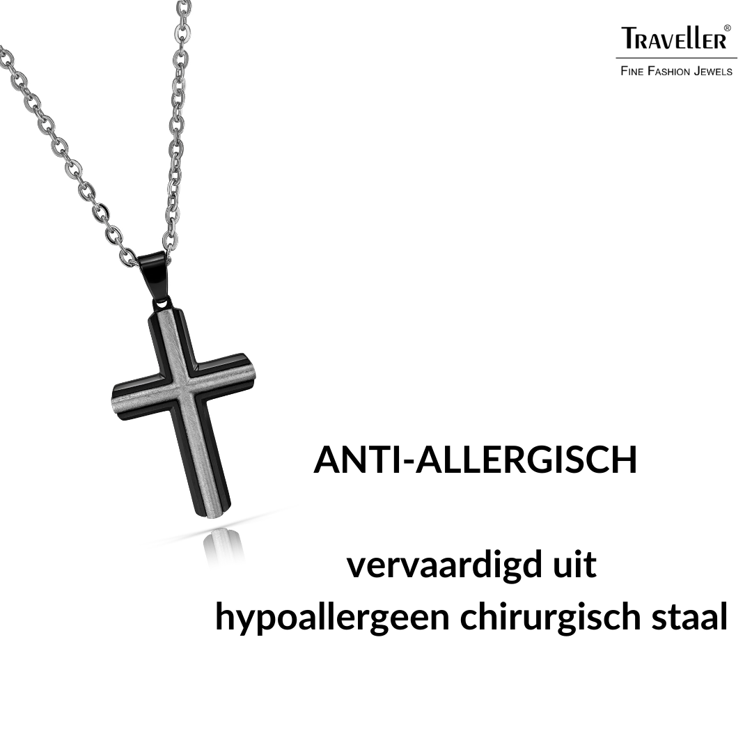 Deze zwart met zilverkleurige kruis-ketting van Traveller is stijlvol en stoer. Het kruis is zilverkleurig met zwarte omlijsting. De ketting is gemaakt van edelstaal en is in lengte verstelbaar, zodat u zelf kunt kiezen op welke lengte u hem wil dragen (50 of 55 centimeter). De ketting heeft een breedte van 29 millimeter.
