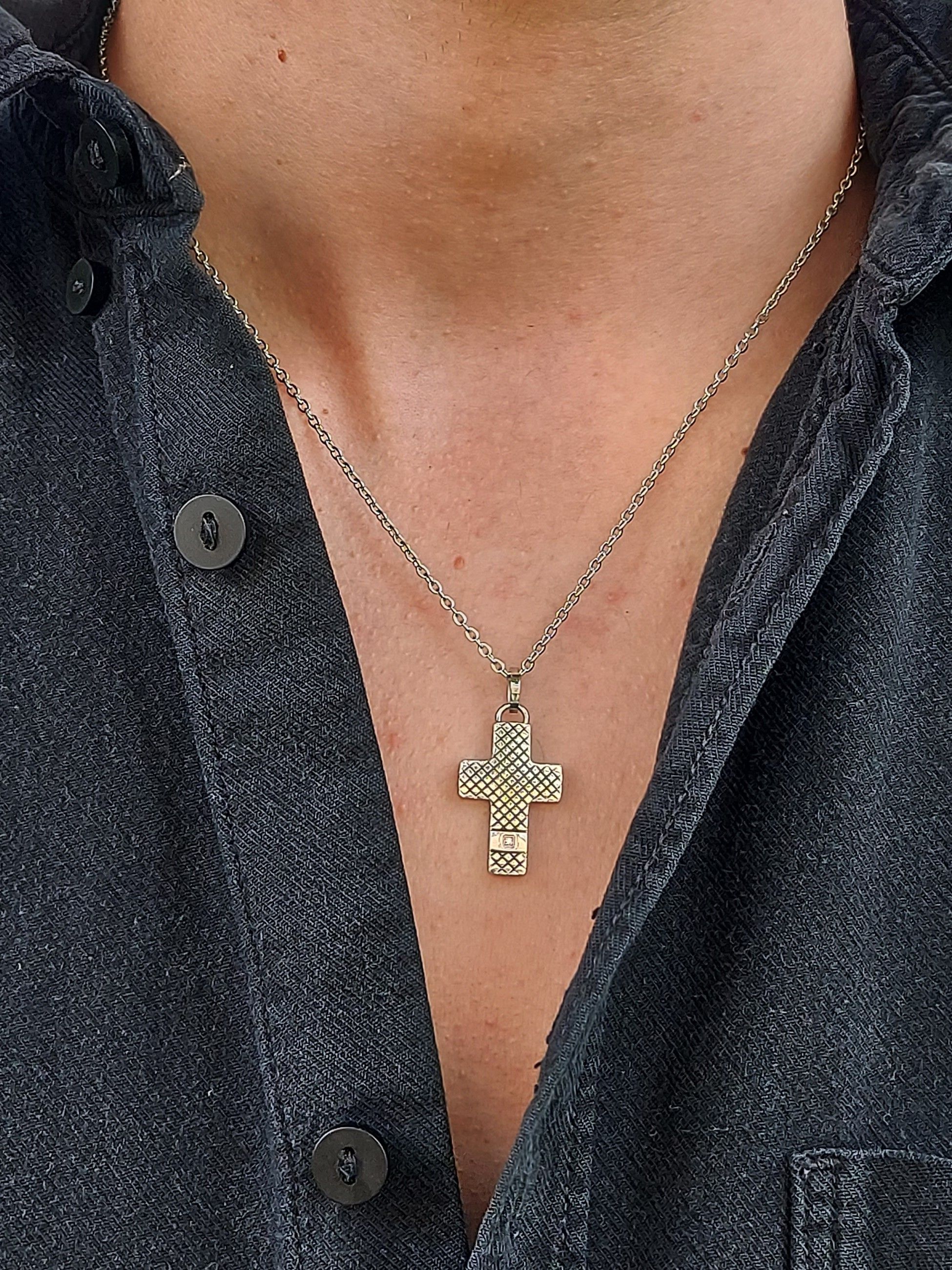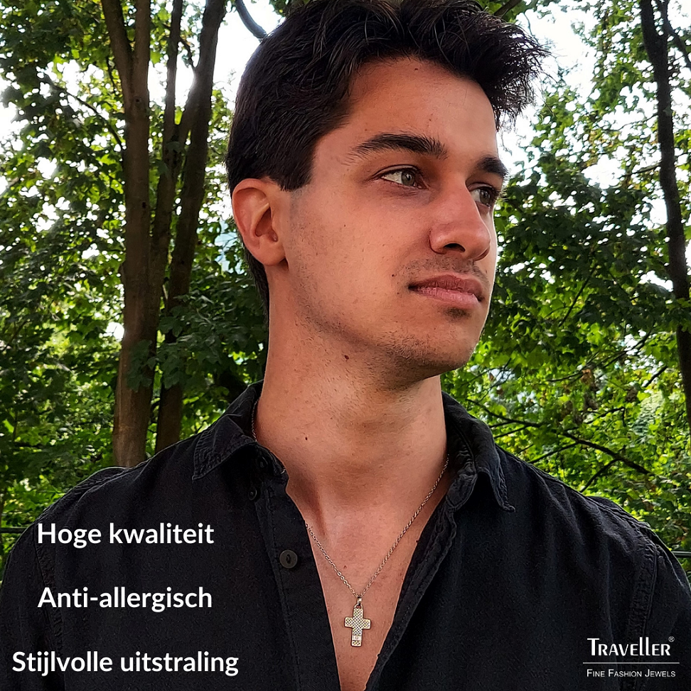 Deze ketting van Traveller heeft een hanger met een opvallend ontwerp. Het kruis heeft een wafeltextuur en onderaan een fonkelend zirkonium. De hanger is 16 millimeter breed. Dankzij het verlengstukje kan de ketting in lengte versteld worden van 50 tot 55 centimeter. De zilverkleurige ketting is gemaakt van hoogwaardig edelstaal.