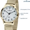 Dit tijdloze goudkleurige horloge van ATRIUM kan gedragen worden door veel mensen. Dat komt door de rekband die ook ingekort kan worden. Deze band is van edelstaal. De horlogekast rondom het mineraalglas is ook van edelstaal gemaakt en beschermt het kroontje. Ten slotte is het horloge 5 bar waterdicht, dit wil zeggen dat het tegen spatwaterdicht en regen kan, dat je je handen ermee kunt wassen en ermee in bad kan (douchen kan niet).