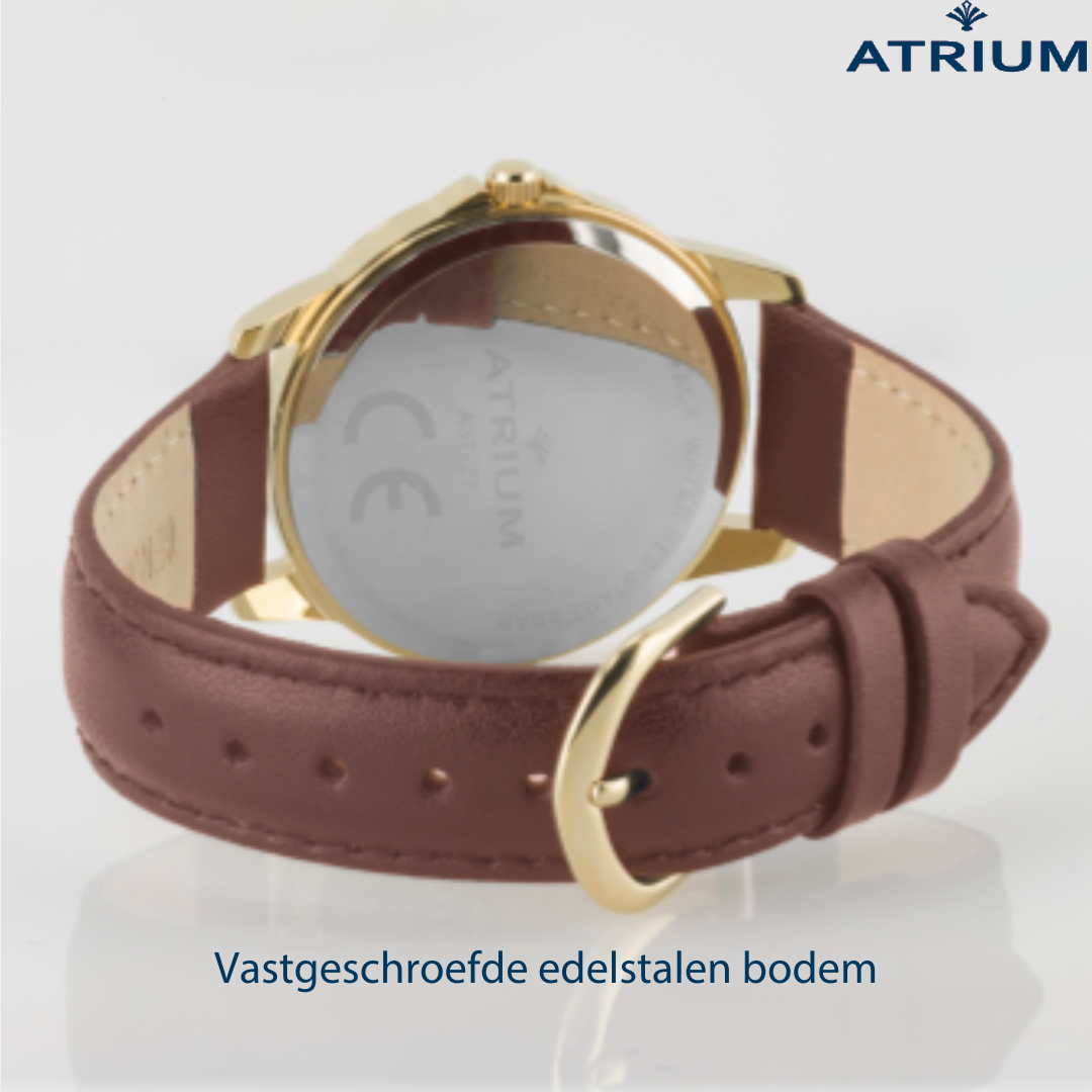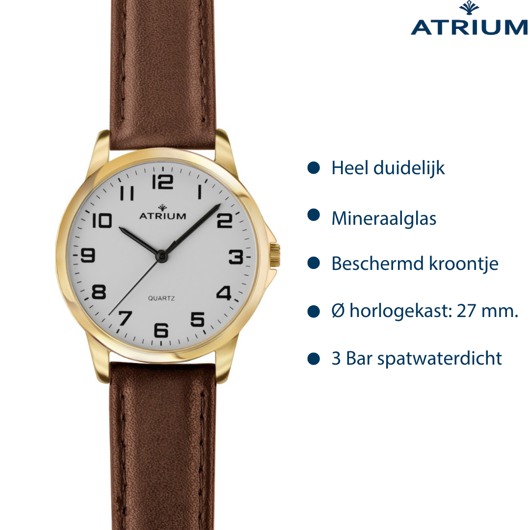 ATRIUM Horloge - Dames - Goudkleurig - Analoog - Bruin Leren Bandje - Duidelijk Wit Wijzerblad - 27 mm