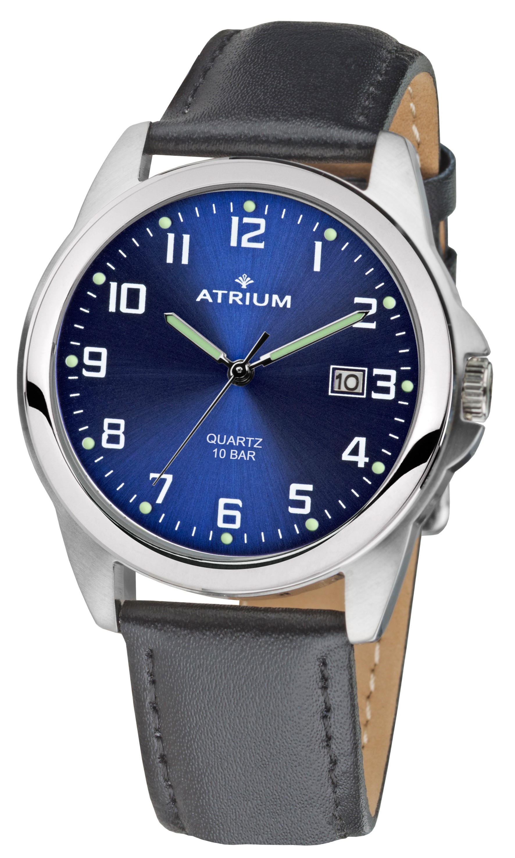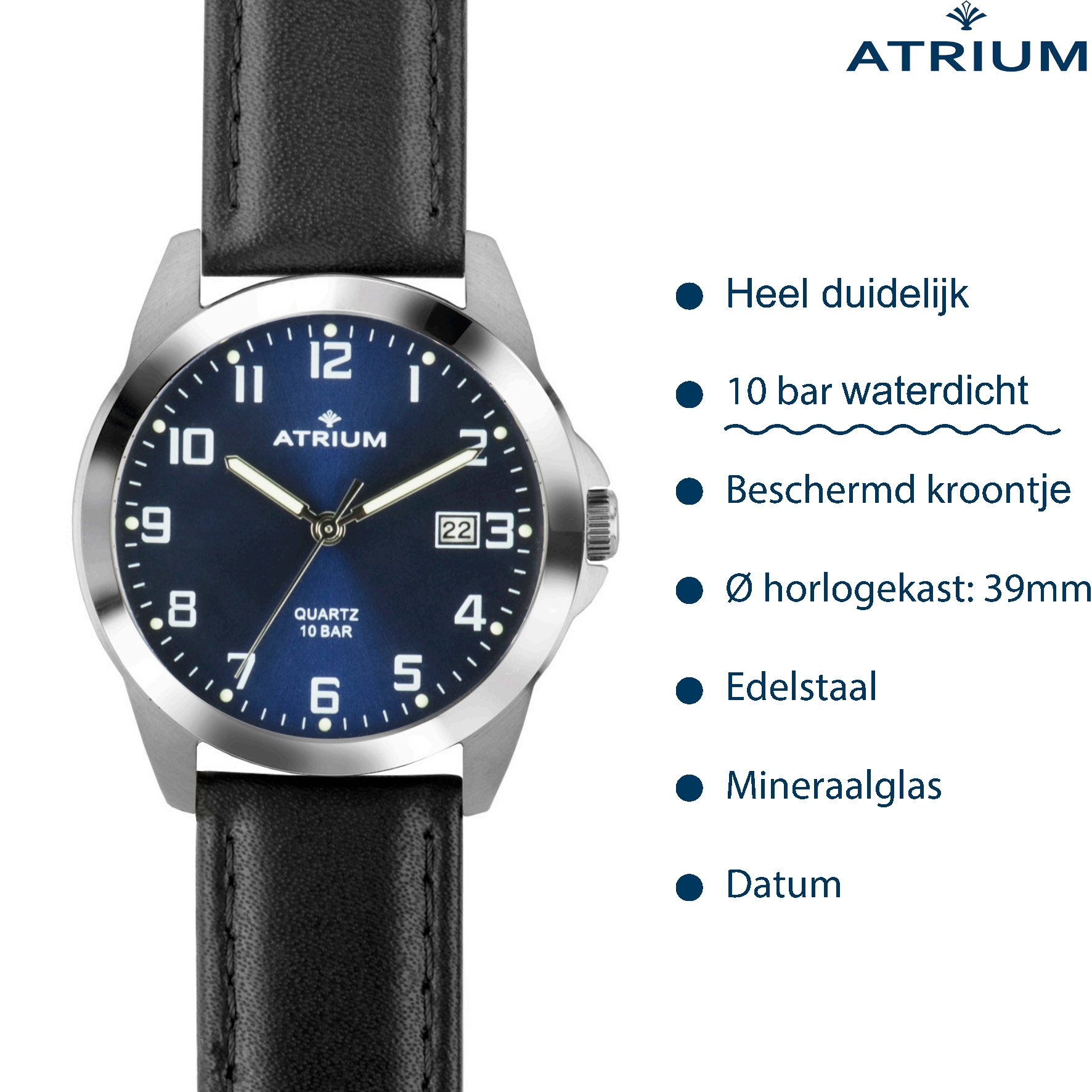 ATRIUM Horloge - Heren - Edelstaal - 10 Bar - Analoog - Zwart Leren Bandje -Blauw Wijzerblad - Datum