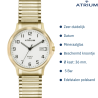 Dit tijdloze horloge van ATRIUM geeft niet alleen de datum weer, maar kan ook gedragen worden door veel mensen. Dat komt door de rekband die ook ingekort kan worden. Deze band is van verguld edelstaal en meet 21 centimeter, echter doordat het een rekband is, is dit een flexibele maat. De horlogekast is ook van verguld edelstaal gemaakt en beschermt het kroontje. Ten slotte is het horloge 5 bar waterdicht, dit wil zeggen dat het tegen spatwaterdicht en regen kan, dat je je handen ermee kunt wassen en ermee in bad kan (douchen kan niet).