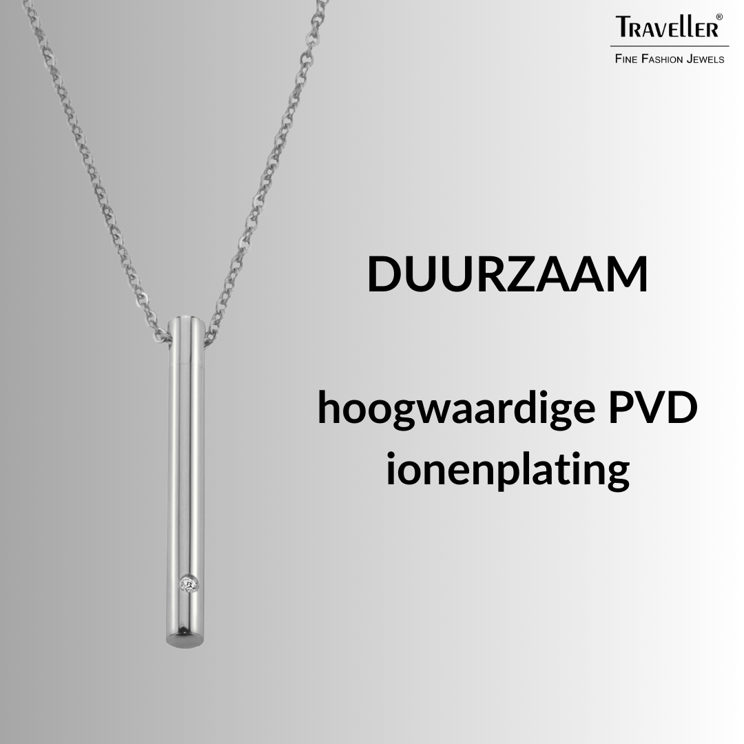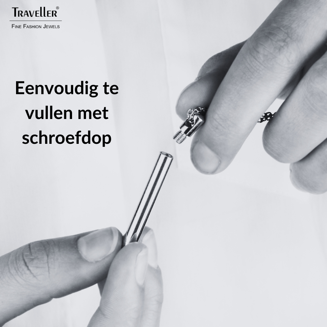 Met deze ketting van Traveller kun je altijd je dierbare bij je dragen. Aan de ketting hangt een koker om as in te bewaren. Deze askoker is aan de onderkant versierd met een zirkonium. De ketting en hanger zijn gemaakt van zilverkleurig edelstaal. De hanger heeft een lengte van 45 millimeter, de ketting is in lengte verstelbaar van 45 tot 50 centimeter.