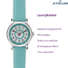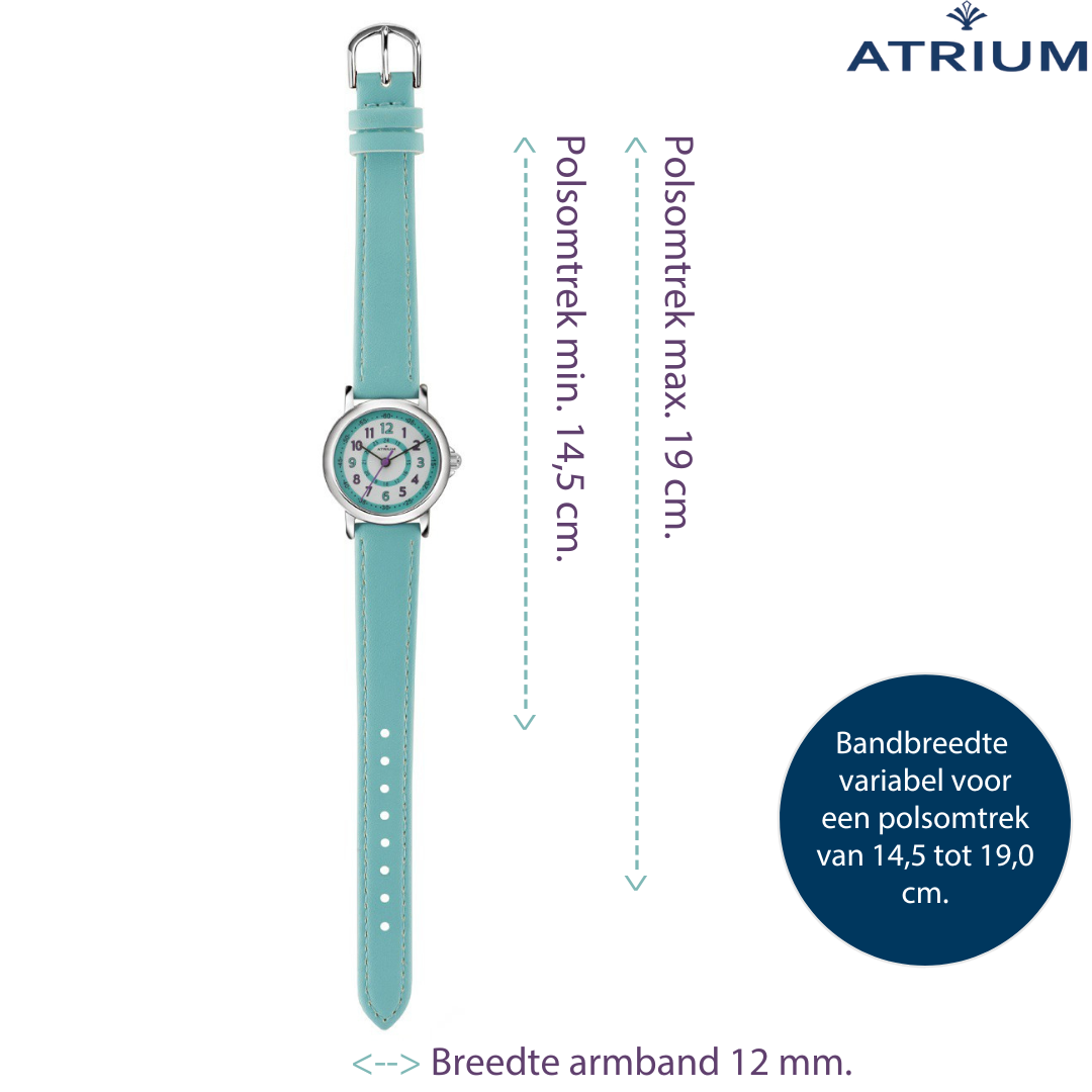 De bonte kinderhorloges van ATRIUM zijn niet alleen mooi, maar helpen ook uw kind bij het leren lezen van de kloktijd. De duidelijke 12- en 24uursweergave en minutenindeling vergemakkelijken het aflezen van de uurtijd. Het zachte bandje past zich goed aan kinderarmen aan en is daarom ook geschikt om dagelijks te dragen. Door de 5 bar waterdichtheid is het horloge goed beschermd tegen water. Het vrolijke mintkleur met donker paarse accenten maakt het horloge tot een trendy accessoire.