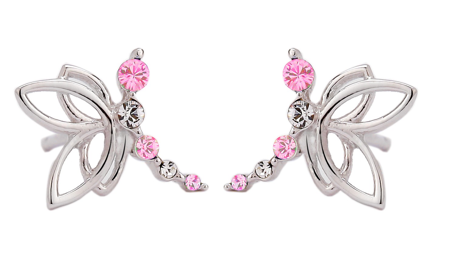 Travellers best verkochte paar (kinder)oorbellen Zala in de vorm van een libelle... of elfje; Met wat fantasie kun je ervan maken wat je zelf wil! Zala is een sterling zilveren paar oorstekers bezet met kleine roze en witte kristallen van Preciosa. Doordat de oorstekers zilver geplatineerd zijn, kan ieder oor ze (ver)dragen. Zala is dus ook geschikt als cadeautje.