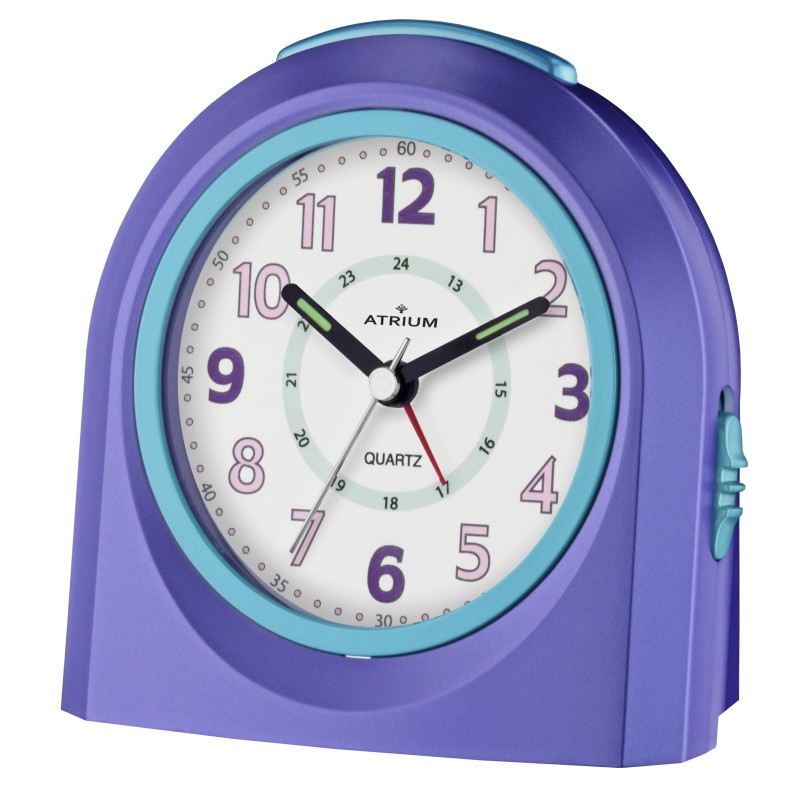 De vrolijke, paarse wekker van ATRIUM beschikt over een sluimerfunctie en LED-verlichting, die na activering 5 seconden brandt. De duidelijke wijzerplaat met bontgekleurde cijfers en aangegeven minuten maakt het lezen van de tijd makkelijker. De geruisloze kwartsklok zorgt voor een ongestoorde nacht slapen.