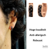 Een paar oorbellen van Traveller met een stijlvol, tijdloos ontwerp. Deze edelstalen oorringen zijn rosé verguld en hebben details van carbon met een ruitjesmotief. De oorbellen hebben een diameter van 1,4 centimeter en wegen per stuk zo'n 1,5 gram.