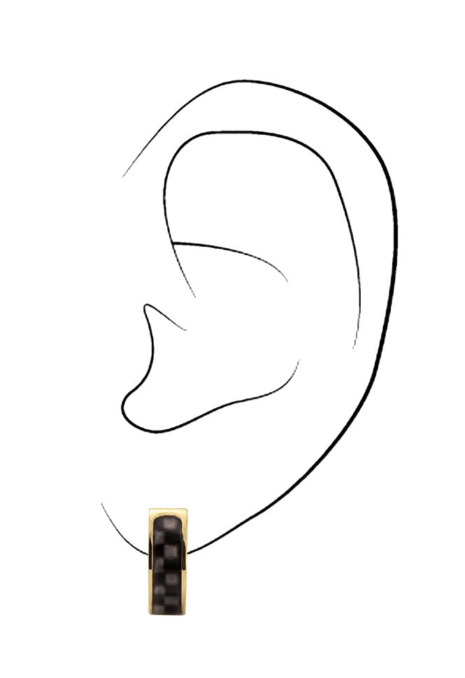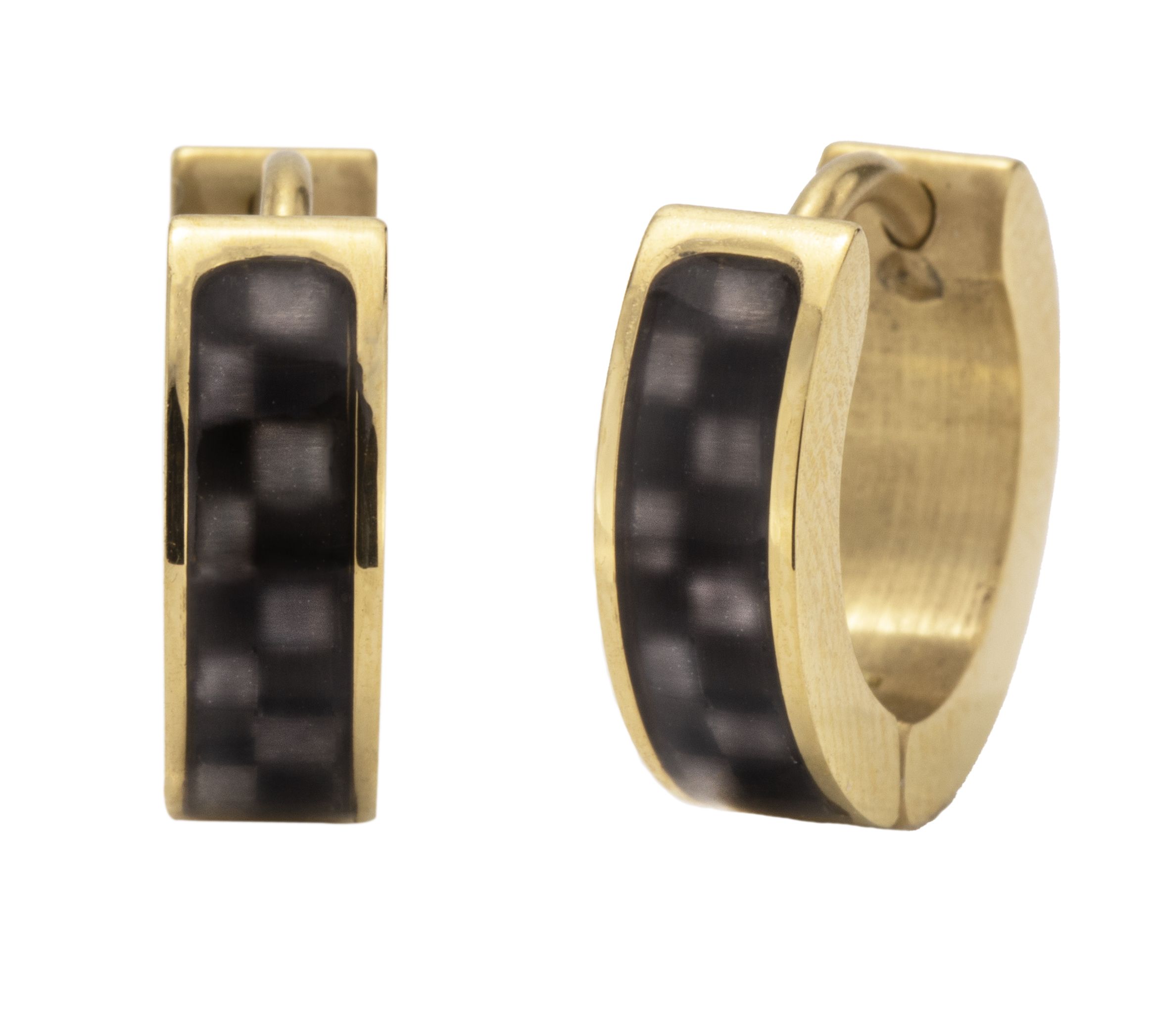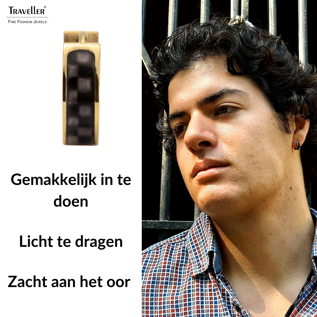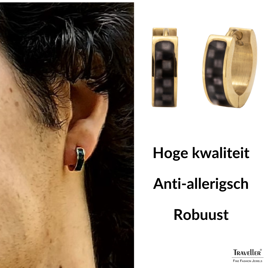 Een paar oorbellen van Traveller met een stijlvol, tijdloos ontwerp. Deze edelstalen oorringen zijn verguld en hebben details van carbon met een ruitjesmotief. De oorbellen hebben een diameter van 1,4 centimeter en wegen per stuk zo'n 1,5 gram.