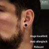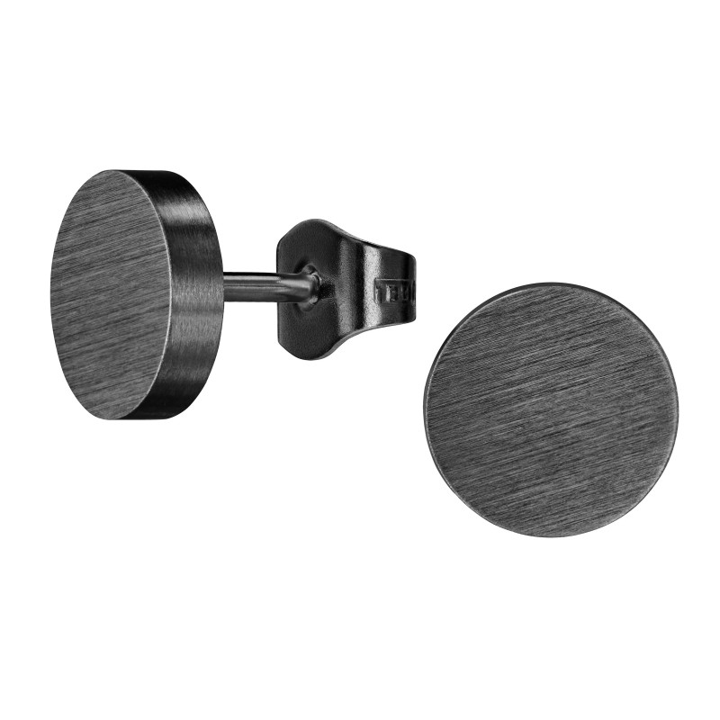 Een paar oorbellen van Traveller met een stijlvol, tijdloos ontwerp. Deze mat zwarte edelstalen oorstekers hebben de vorm van een cirkel. De oorbellen hebben een diameter van 0,8 centimeter en wegen per stuk zo'n 2 gram.